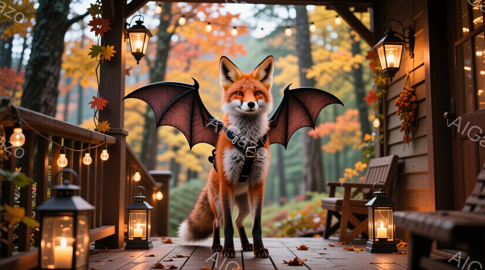 明るいオレンジ色のキツネが、小さな黒い翼とハーネスをつけて木製のデッキに立っている。背景には、秋の紅葉と提灯で飾られた家があり、暖かく幻想的な雰囲気を醸し出している。キツネは前方をまっすぐ見つめ、落ち着いた表情で、まるでモデルのようにポーズをとっている。