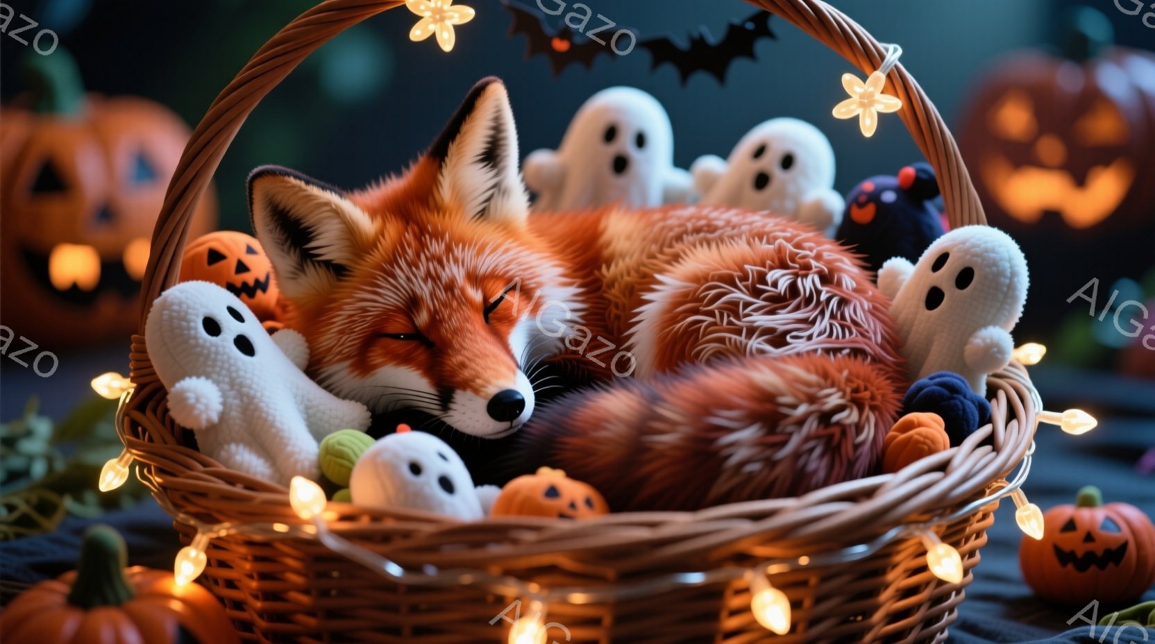 温かい光に照らされたバスケットの中に、毛並みの美しいオレンジ色の狐が丸まって眠っています。周りにはハロウィーンの飾りであるカボチャやお化けのぬいぐるみ、そしてキラキラと光る電飾が配置され、幻想的な雰囲気を醸し出しています。背景は暗く、カボチャがぼんやりと見え、全体的に温かく、遊び心のあるハロウィーンの雰囲気が漂っています。