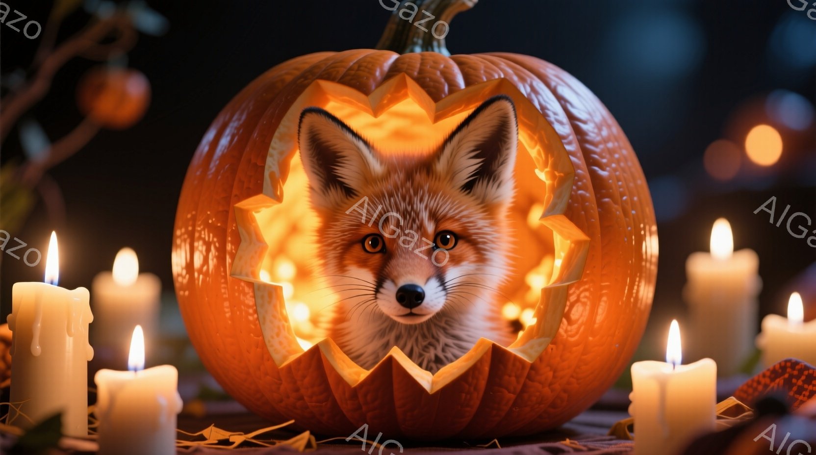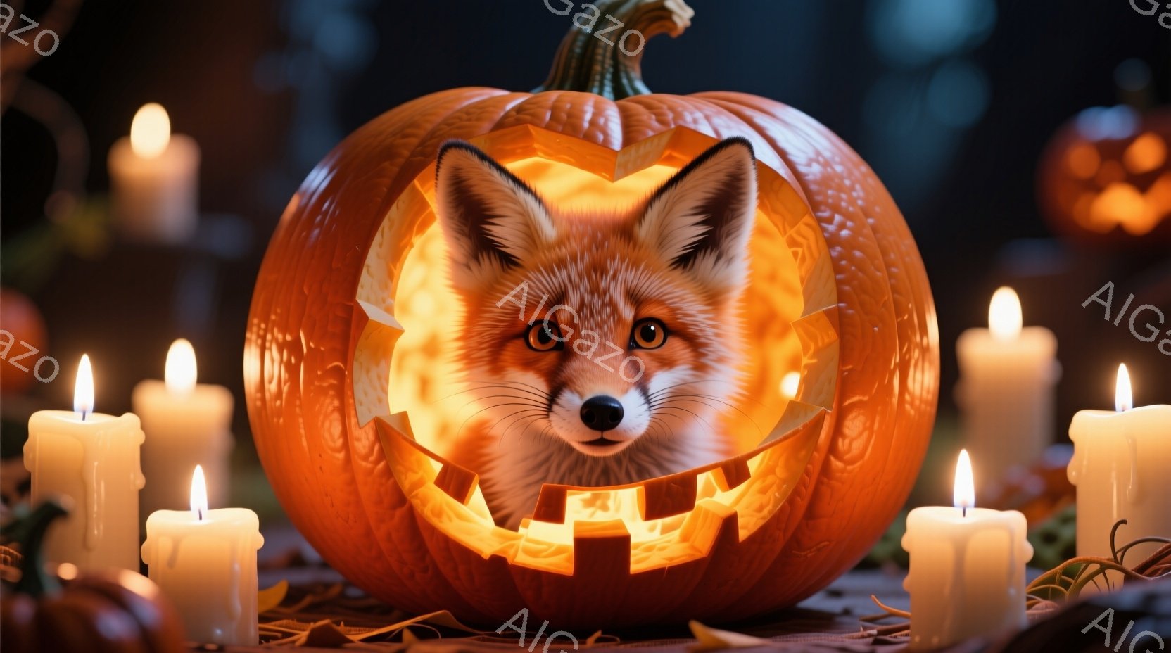 明るいオレンジ色のジャック・オー・ランタンの中に、愛らしいキツネが顔を覗かせています。キツネは好奇心に満ちた表情で正面を見つめ、その周囲にはハロウィンの雰囲気を盛り上げるように、点灯されたキャンドルが並んでいます。背景は暗く、他のジャック・オー・ランタンがぼんやりと見えることから、ハロウィンの夜の神秘的な雰囲気を醸し出しています。