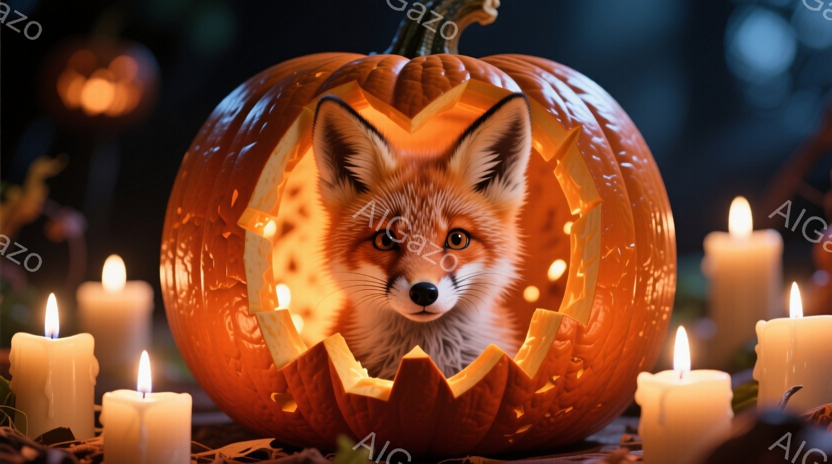 切り開かれたカボチャの中に、鋭い眼光を放つキツネの顔が浮かび上がっている。周囲には、燃え盛る蝋燭が配置され、暖かく幻想的な光を放ち、背景にはぼんやりとした木々が見える。全体的にハロウィーンらしい、神秘的でどこか不気味な雰囲気が漂っている。