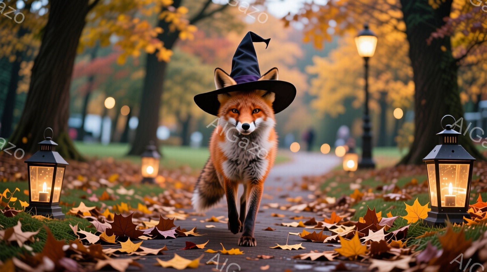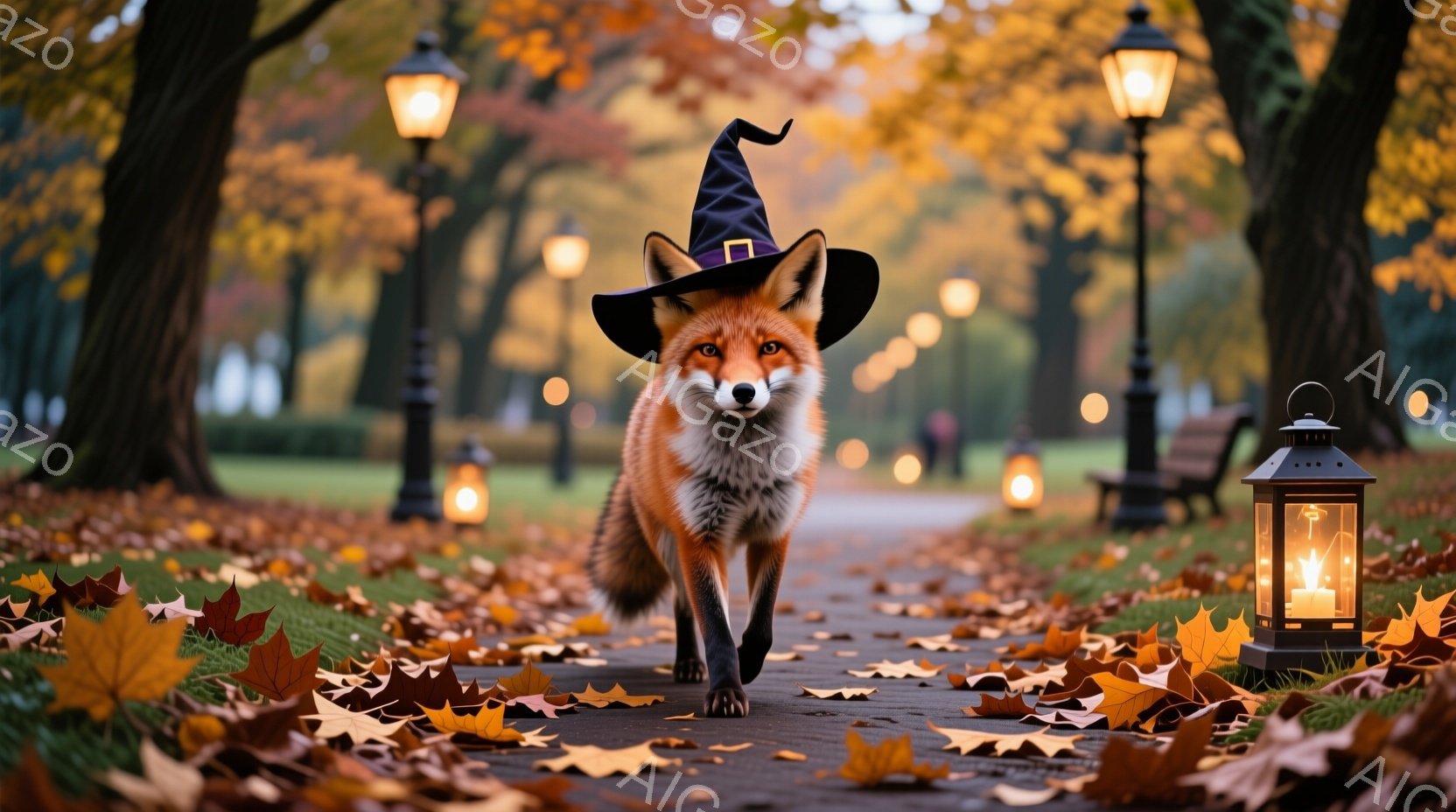 オレンジ色の毛並みのキツネが、黒い魔女帽子をかぶり、レンガ造りの道を歩いている。背景には、黄金色に色づいた木々と灯りがともったランタンが並び、秋の暖かい雰囲気を醸し出している。落ち葉が道に散らばり、キツネの歩く様子が、ハロウィンの季節を感じさせる。