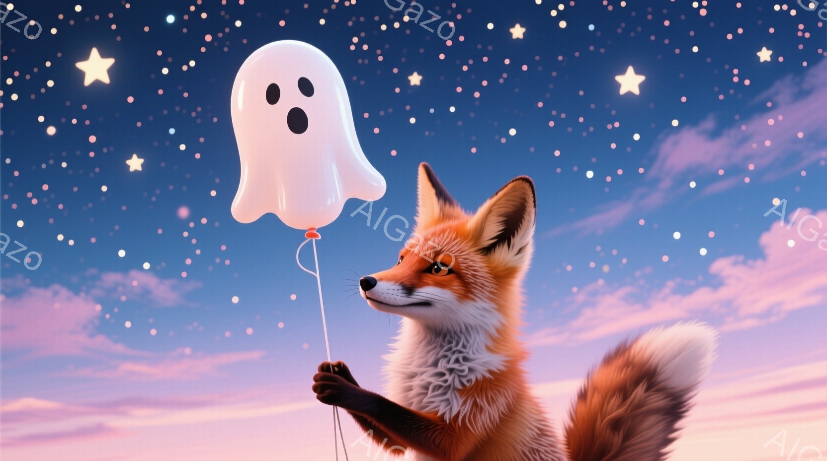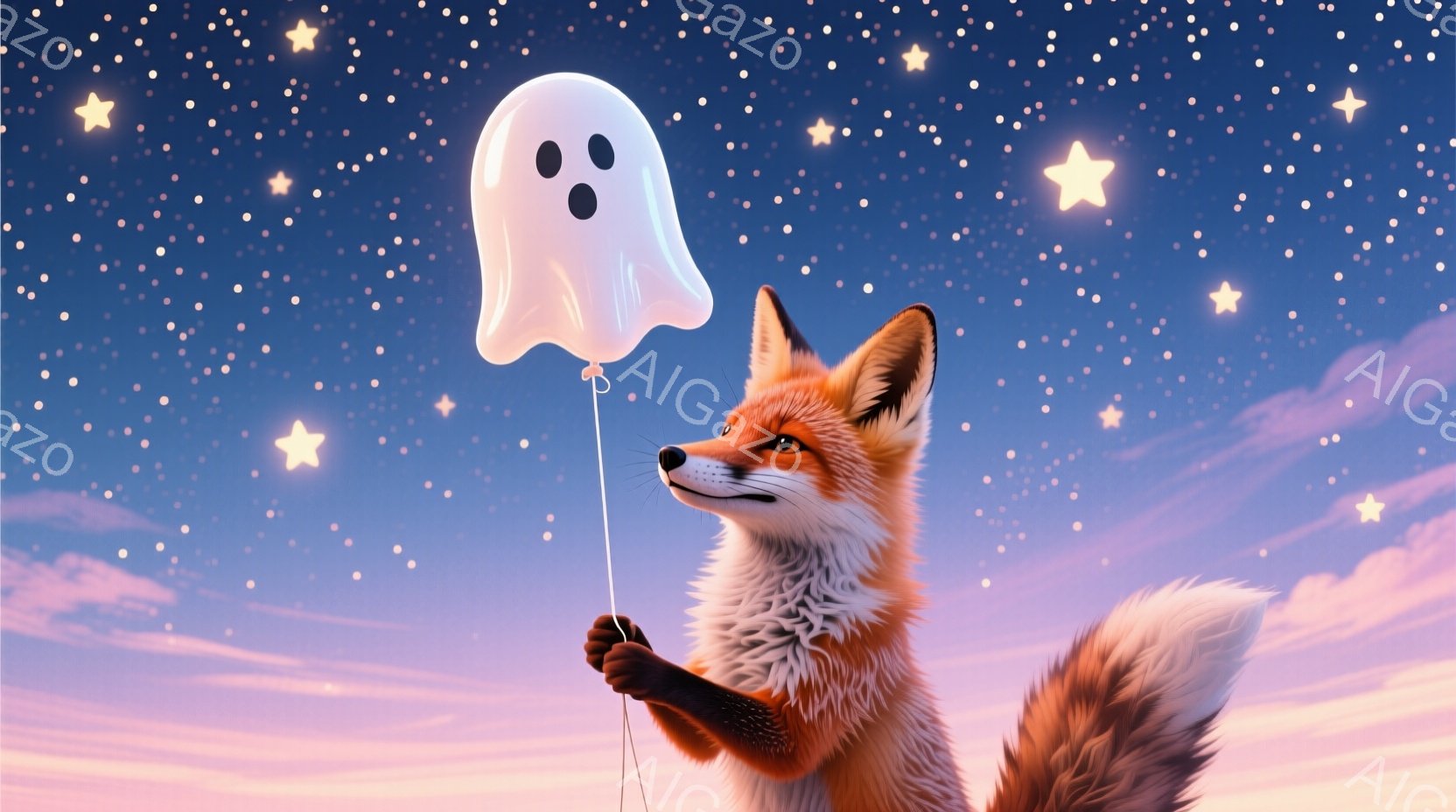 明るいオレンジ色のキツネが、白いお化けの形をした風船を片方の前足で持っている。背景は、ピンクと紫が混ざり合った美しい夕焼け空で、たくさんの星が輝いている。 キツネは少し上を見上げ、穏やかで優しい表情を浮かべている。