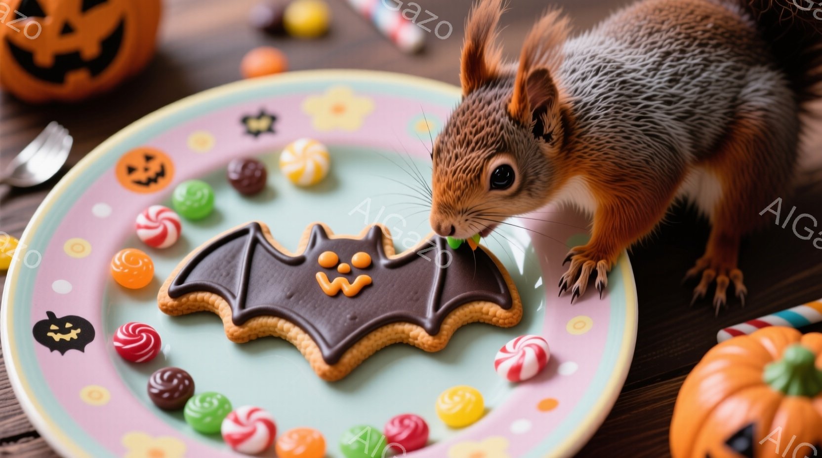 一匹のリスが、ハロウィーンをテーマにしたクッキーとキャンディーが並んだお皿に鼻を近づけています。背景には、さまざまな大きさのジャック・オ・ランタンが散りばめられ、秋のハロウィーンの雰囲気を演出しています。全体的に、可愛らしく、遊び心のある、温かい雰囲気の画像です。