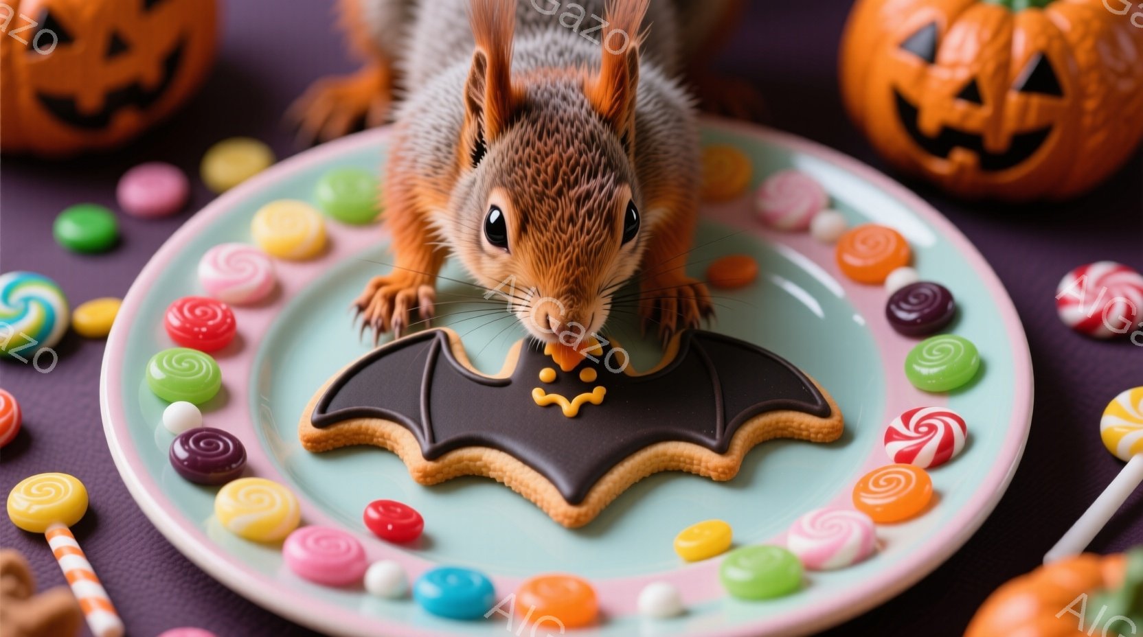 リスがハロウィーンの装飾された柵の上に座っています。リスは小さな魔女帽子をかぶり、前足で柵につかまり、好奇心と楽しげな表情をしています。背景には秋の木々が広がり、オレンジ色のカボチャが連なり、暖かくお祝いの雰囲気を醸し出しています。