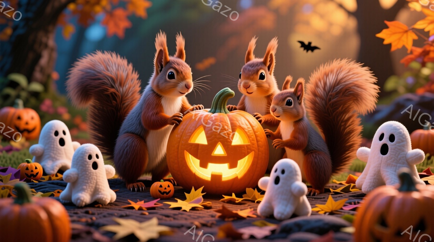 赤褐色のリスが、ハロウィーンの魔女帽子を被り、木の柵の上でポーズをとっています。周りには様々な大きさのジャック・オ・ランタンが並び、背景には秋の紅葉と緑の芝生が広がっています。全体的に、秋らしい暖かく愉快な雰囲気が漂っています。