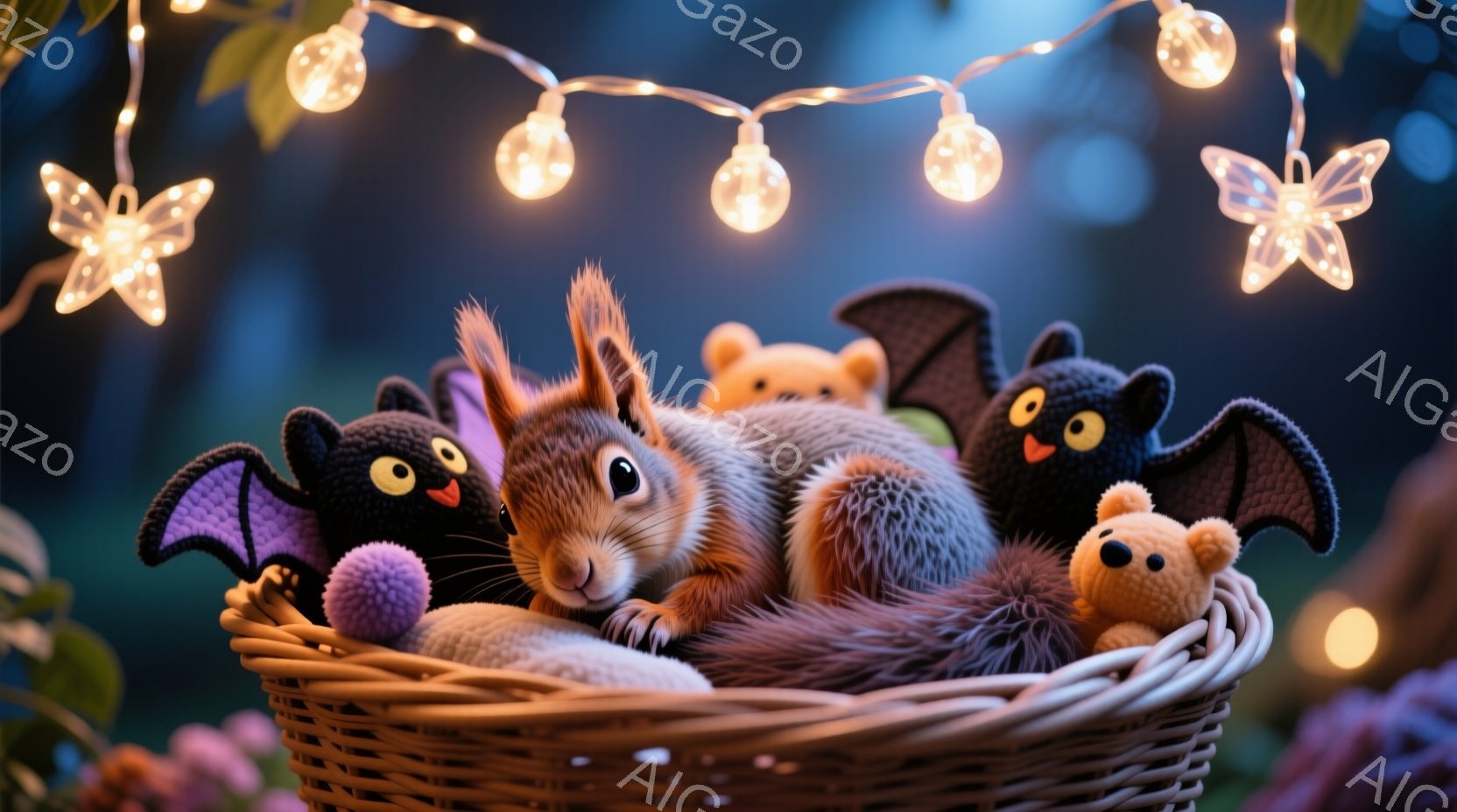籠の中に、ふわふわの毛並みを持つリスが横たわっており、両脇には黒いコウモリのぬいぐるみがあります。リスは前足を組み、穏やかな表情でこちらを見ており、背景にはぼんやりとした緑と、温かい光を放つ電飾が飾られています。全体的に、温かく、可愛らしい、秋らしい雰囲気を醸し出しています。