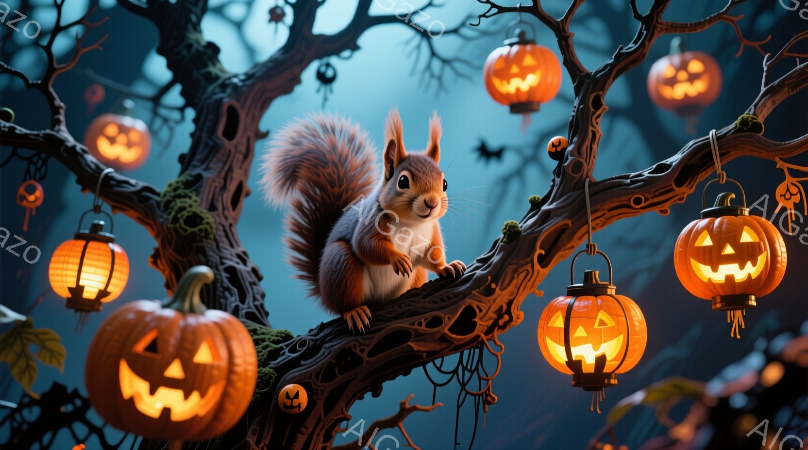 カボチャのランタンで飾られた木の枝に座っているリスが描かれています。リスはオレンジ色の毛並みで、つぶらな瞳で前を見つめており、可愛らしい表情をしています。背景は暗い夜空で、コウモリが舞い、ハロウィーンの雰囲気が漂っています。