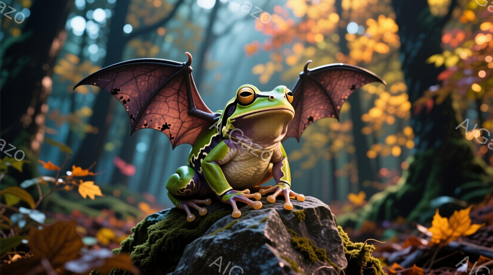 緑色のカエルが苔むした岩の上に座り、まるで翼のような黒い膜状の構造を広げています。背景は秋の森林で、落ち葉が散りばめられ、木々の間から差し込む光が幻想的な雰囲気を醸し出しています。カエルは前足を広げ、自信に満ちた表情で、まるで自然界の守護者のようです。