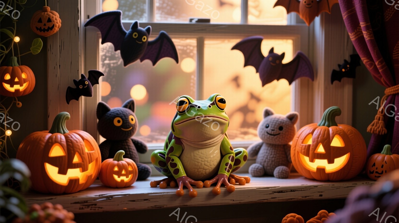 窓辺にカエル、テディベア、そしてハロウィーンのジャック・オー・ランタンが並んでいます。カエルは緑色で、少し笑ったような表情をしています。背景には夜の風景が見え、黒いコウモリが飛び交い、全体的にハロウィーンの温かく幻想的な雰囲気が漂っています。