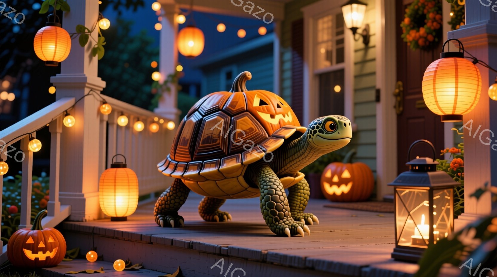ハロウィーンの装飾が施された家の玄関ポーチに、カボチャの殻を背負った可愛らしいカメが立っています。カメは前足を前に出し、少し上目遣いで何かを見ているような表情をしています。背景には、オレンジ色のランタンやカボチャが飾られ、暖かい光がポーチ全体を照らし、お祝いムードを演出しています。
