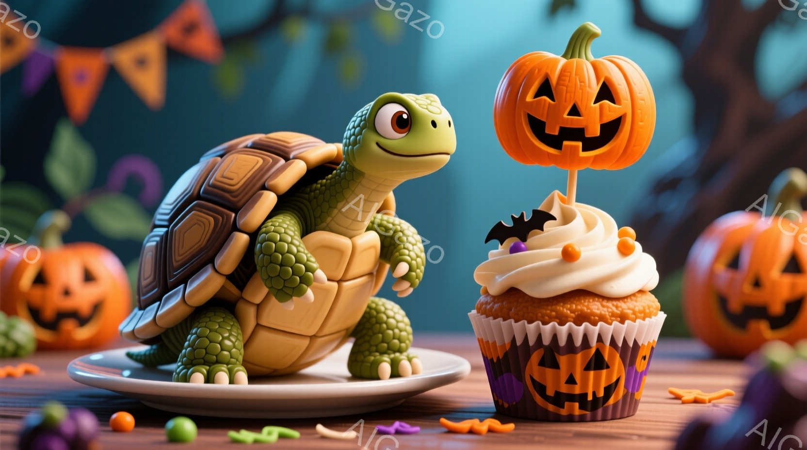 チョコレート色のカップケーキの上に、可愛らしい小さな亀が乗っています。背景には、さまざまな表情をしたジャック・オ・ランタンが並び、ハロウィーンの楽しい雰囲気を醸し出しています。テーブルの上には、カラフルなキャンディーが散りばめられており、全体的に温かく、お祝いムードに満ちた印象です。