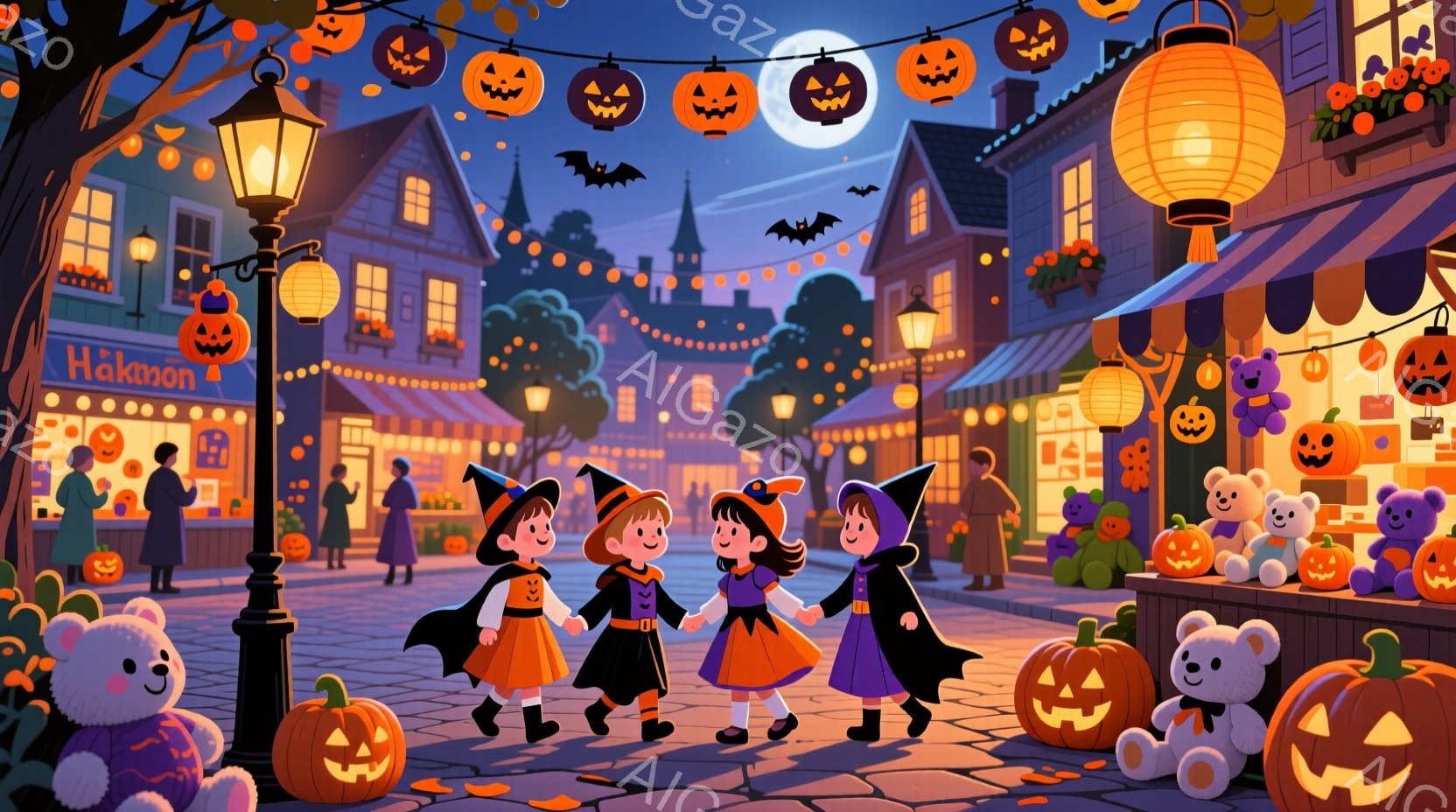 ハロウィーンの夜、3人の少女が魔女の衣装を着て街を歩いている。彼女たちは黒いドレス、先の尖った帽子、そして赤いリボンを身に着け、楽しそうな表情で前を見つめている。背景には、カボチャのランタンやテディベアで飾られた商店街が広がり、暖かく幻想的な雰囲気を醸し出している。