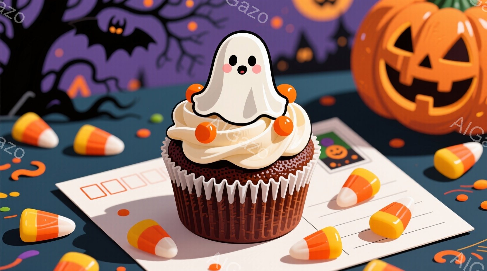 オレンジ色のカップケーキの上に白いお化けのクリームが乗っており、ハロウィーンらしい可愛らしい光景です。背景には、カボチャのイラストが描かれた手紙と、カラフルなキャンディコーンが散りばめられており、ハロウィーンの雰囲気を盛り上げています。全体的に明るくポップな色彩で、遊び心のある楽しい気分にさせてくれます。