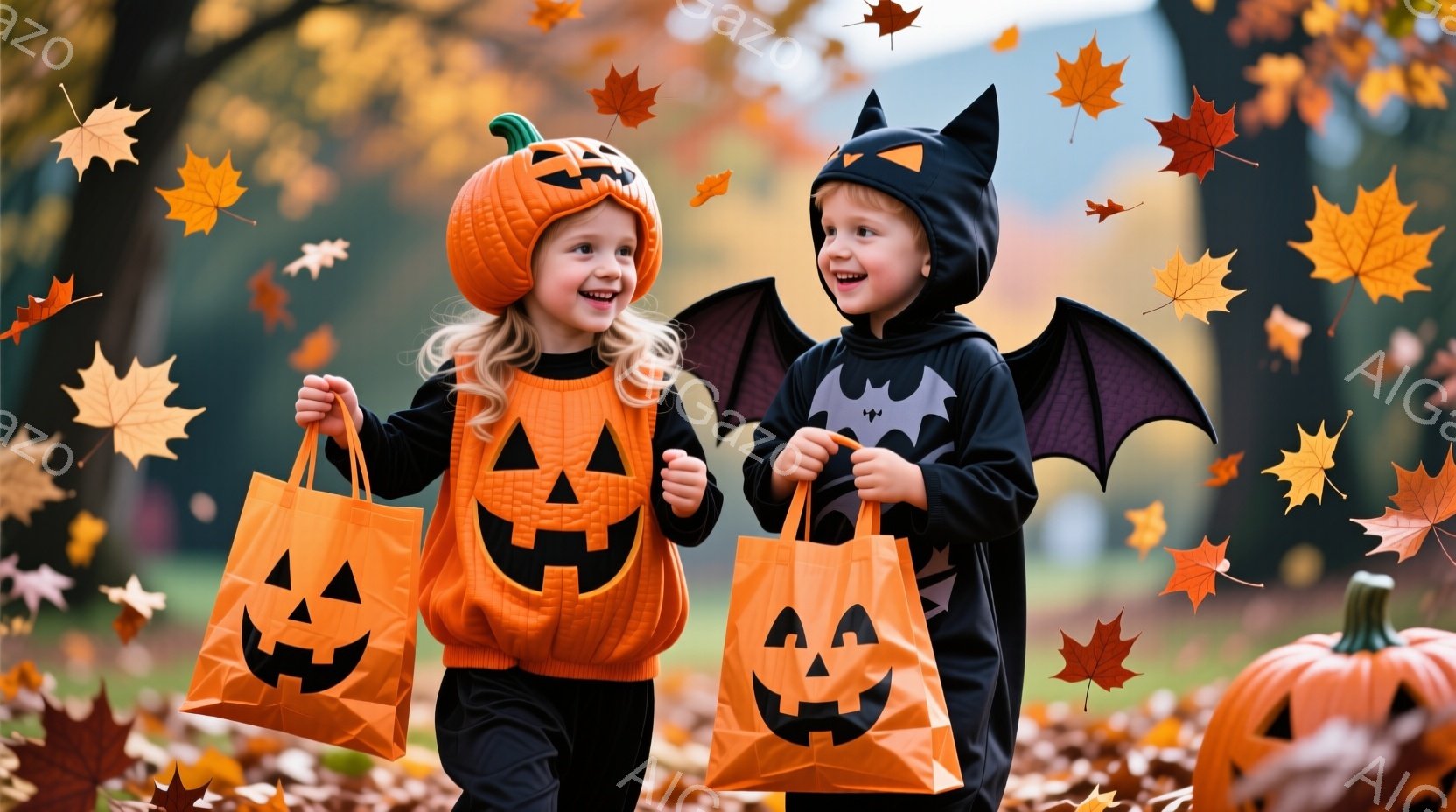 幼い子供たちがハロウィーンの衣装を着て、楽しそうにオレンジ色のカボチャの形をしたバッグを持って走っています。女の子はカボチャの帽子をかぶり、男の子はコウモリのコスチュームを着て、どちらも笑顔で、背景には落ち葉とジャック・オー・ランタンが散らばっています。秋の暖かい日差しが差し込み、華やかで楽しいハロウィーンの雰囲気が漂っています。