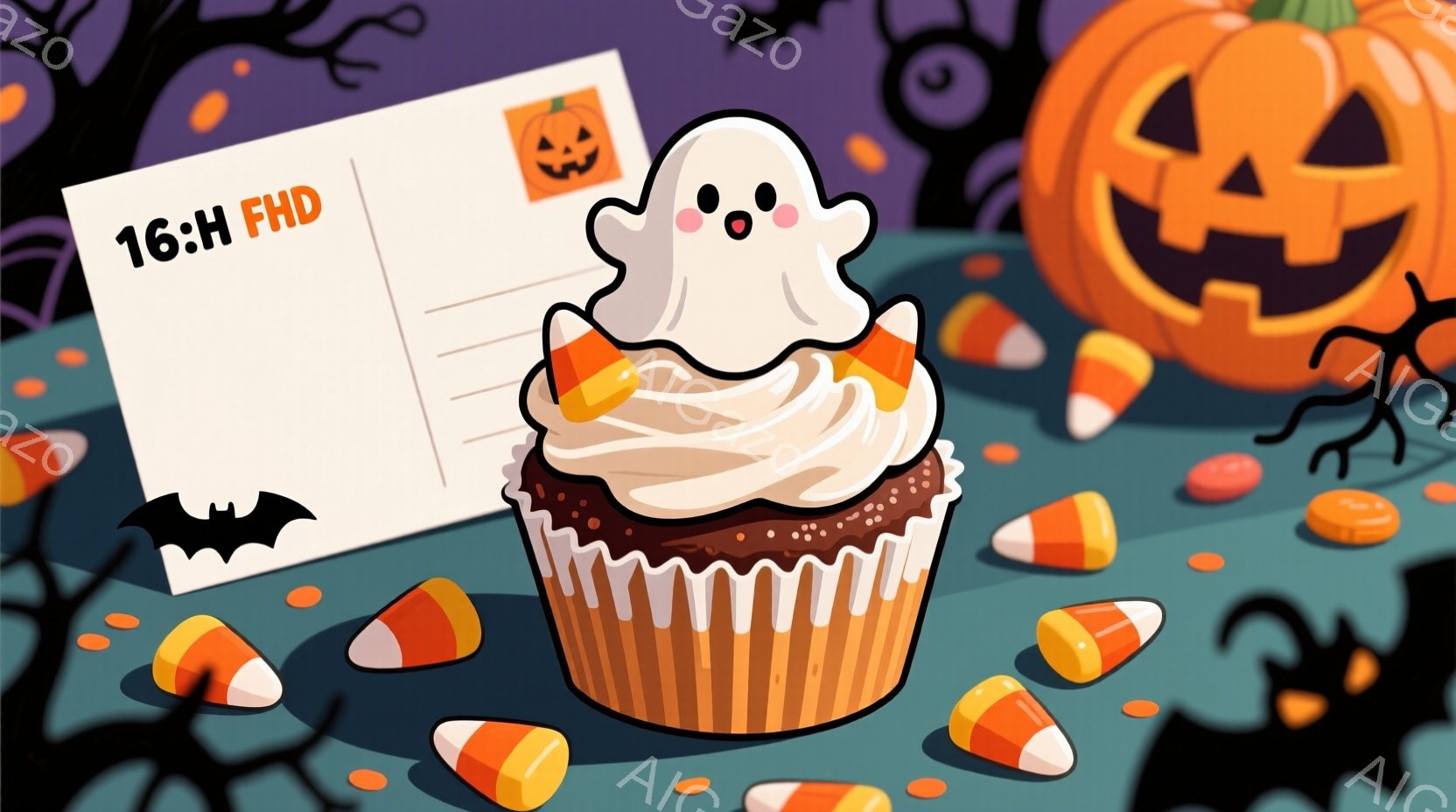 明るい紫色の背景に、チョコレート色のカップケーキが置かれ、その上に白いクリームと小さな幽霊が乗っています。幽霊はかわいらしい表情で、オレンジと黄色のキャンディが周りに散りばめられています。背景には、ハロウィーンを象徴するカボチャの絵が描かれたカードや、黒いコウモリが描かれ、お祝いの雰囲気が漂っています。