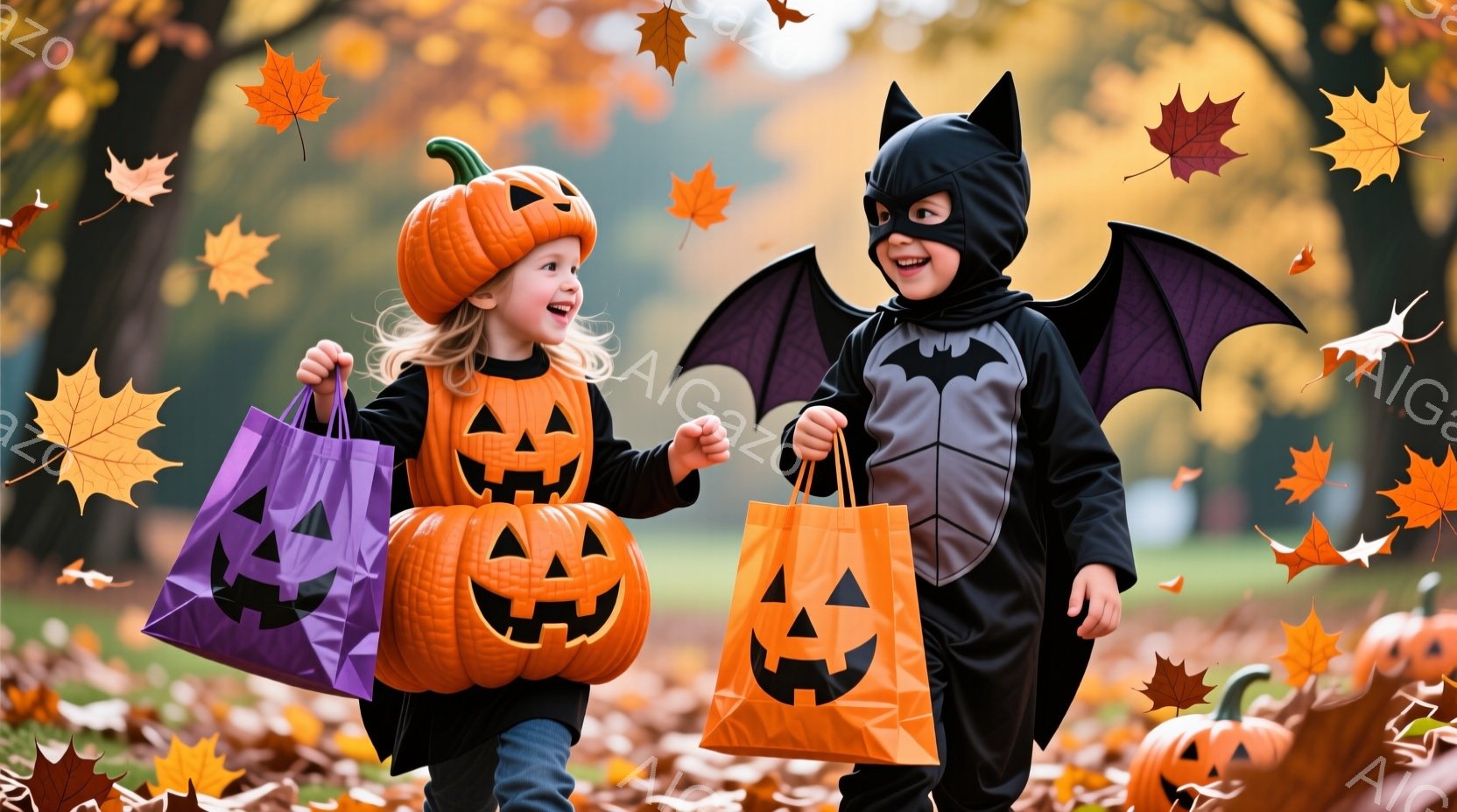 明るいオレンジ色の背景に、可愛らしいハロウィーンの光景が広がっています。大きなカボチャと小さなカボチャがいくつか並び、その中に赤い髪の女の子とオレンジ色の服を着た男の子がいます。地面はカラフルなキャンディーで覆われ、背景にはぼんやりとライトアップされた背景が広がっています。
