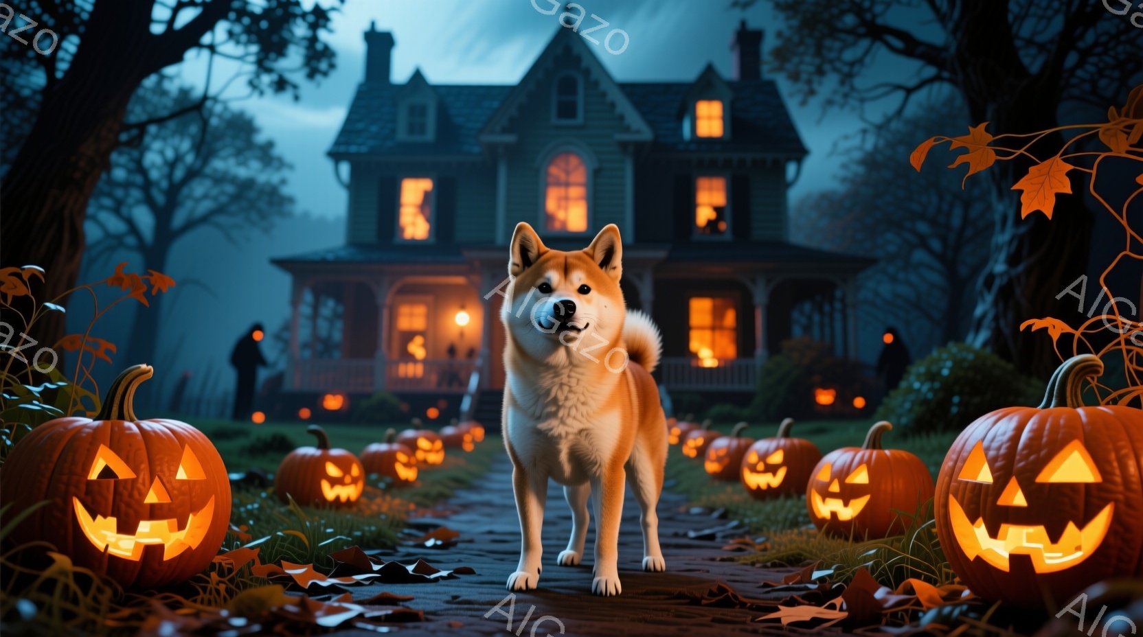 道路にはジャック・オー・ランタンが並び、背景にはライトアップされた不気味な屋敷が見えます。柴犬が道路の中央で前足を伸ばし、正面を見つめて立っており、その表情は少し好奇心旺盛です。秋の夜空で、落葉と不気味な雰囲気の中で、ハロウィーンの夜の様子が表現されています。