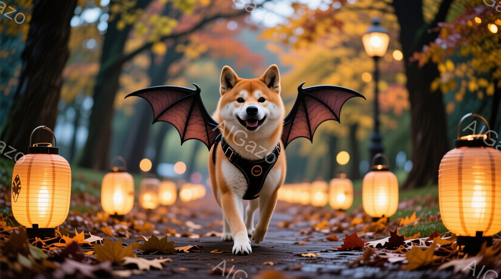 シバイヌがハロウィーンの衣装として翼を付けて、落ち葉が敷き詰められた遊歩道を歩いています。周りには提灯のような光が灯り、背景には秋色の木々がぼんやりと見え、趣のある雰囲気を醸し出しています。犬は前方をまっすぐ見つめ、歩き出すような姿勢で、活気があり、お茶目な表情を見せています。