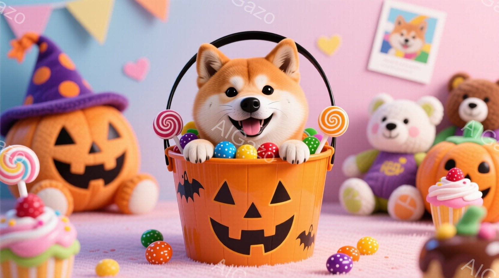 オレンジ色のハロウィンバケツから顔を出し、紫色の魔女帽子を被った柴犬が微笑んでいます。背景には、カラフルなキャンディー、カップケーキ、テディベア、カボチャの置物が配置されており、お祭り気分を盛り上げています。全体的にパステルカラーで統一されており、かわいらしく、明るい雰囲気が漂っています。