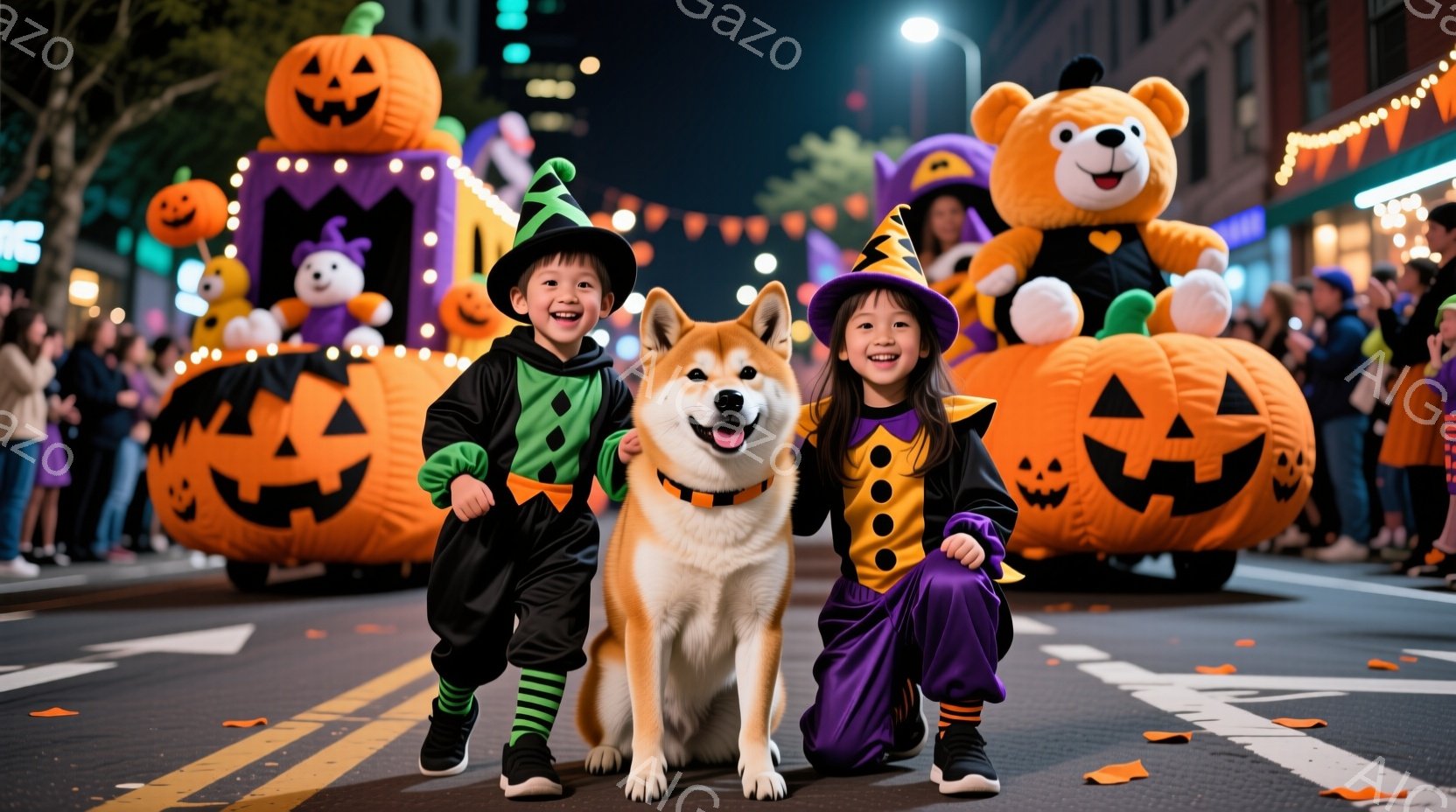 ハロウィーンの衣装を着た幼い男の子と女の子が、同じようにハロウィーンの衣装を着た柴犬と一緒に道路に立っています。男の子は黒い衣装にオレンジ色のストライプが入っており、帽子をかぶっています。女の子も同じような衣装を着ており、二人ともカメラに向かって笑顔でポーズをとっています。背景には、ハロウィーンをテーマにした大きな装飾(カボチャやクマ)や、人々が密集した賑やかな街並みが見え、夜間のイベントの温かい雰囲気が伝わってきます。