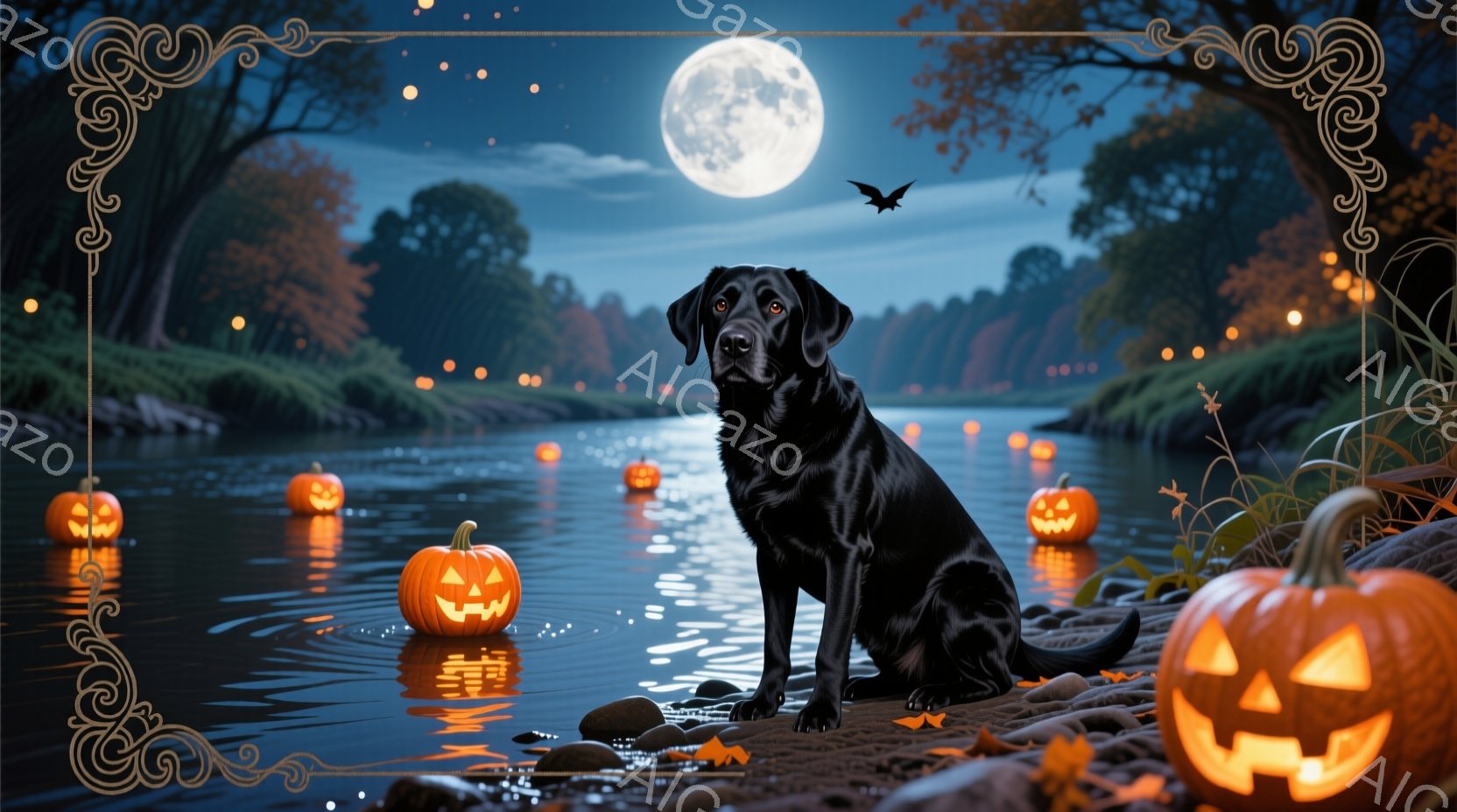 深い森の中を流れる川辺に、黒いラブラドール・レトリバーが座っています。川面には無数のジャック・オー・ランタンが浮かび、不気味ながらも幻想的な光を放っています。満月が夜空を照らし、周囲の木々や水面に影を落とし、ハロウィンの夜の静けさと神秘的な雰囲気を醸し出しています。