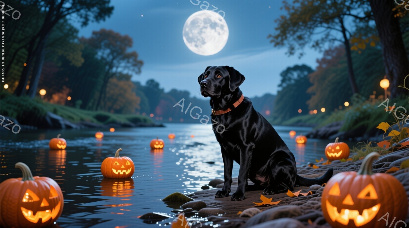暗い水面には、ハロウィーンの象徴であるジャック・オ・ランタンが浮かび、その光が水面に反射して幻想的な光景を作り出している。黒い犬が岸辺に座り、落ち着いた表情で遠くを見つめている。背景には、暗い森と満月が輝き、ハロウィーンの夜の神秘的な雰囲気を醸し出している。