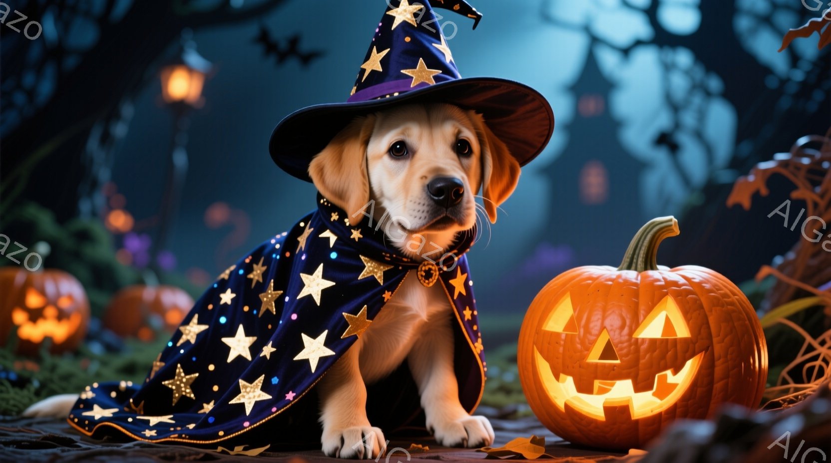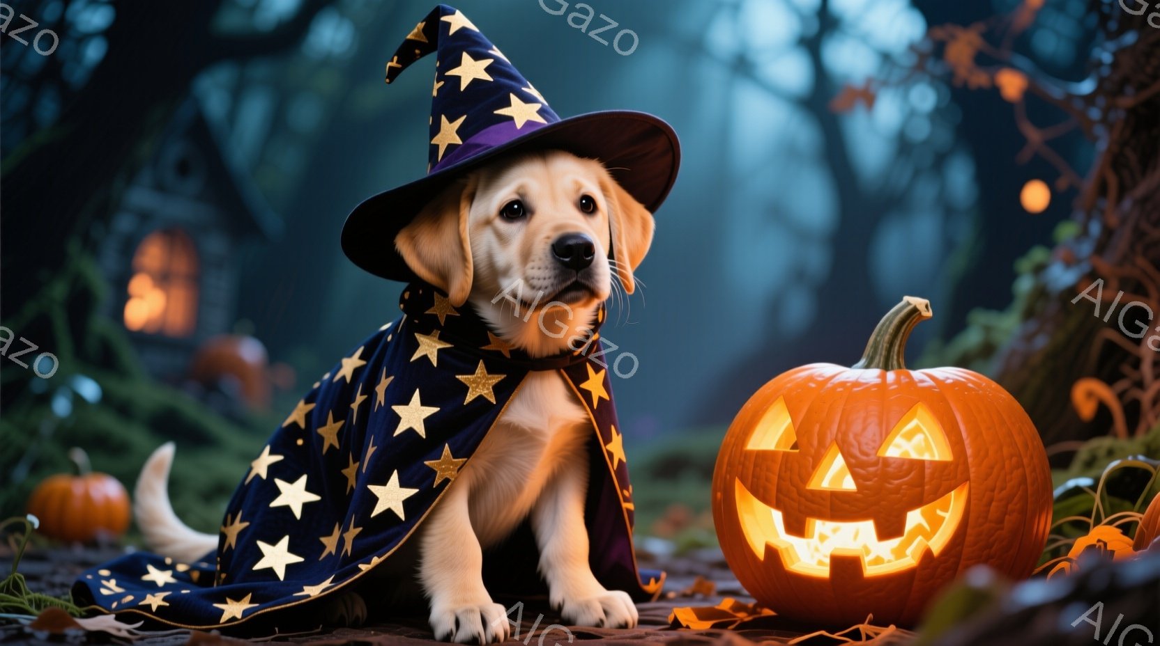 小さな茶色の犬が、星が散りばめられた青い魔法使いの衣装と帽子を身に着けて座っています。犬は穏やかな表情でカメラを見つめ、背景にはハロウィーンのランタンが灯ったカボチャが置かれています。周囲は暗い森で、落ち葉が積もっており、ハロウィーンの夜の幻想的な雰囲気を醸し出しています。