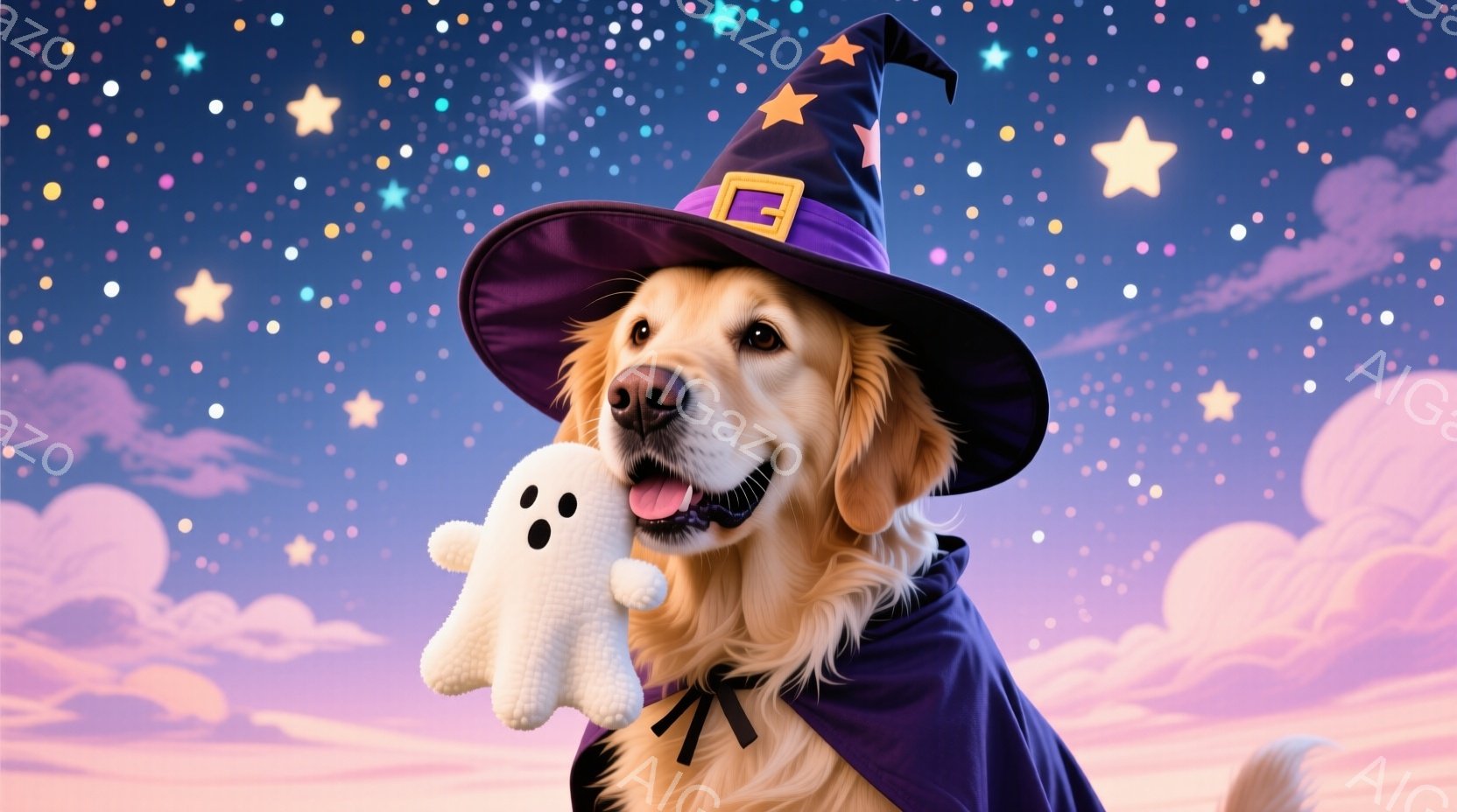 金色のレトリバーが黒い魔女帽子を被り、首に黒いマントを巻いています。口を開けて楽しそうに笑っており、白いゴーストの人形をくわえています。背景は紫とピンクのグラデーションで、星が散りばめられた夜空が広がっており、ハロウィンの楽しい雰囲気が漂います。
