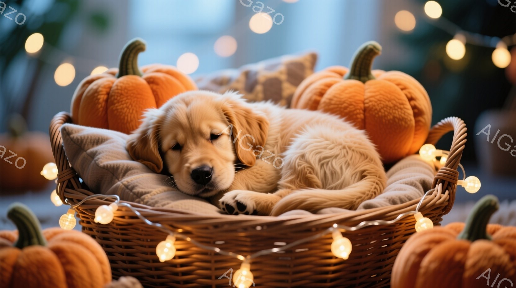 籐で編まれたバスケットの中に、ふわふわの毛並みのゴールデンレトリバーの子犬が丸まって眠っています。子犬はとてもリラックスした表情で、小さな足はちょこんと突き出ています。背景にはハロウィンを連想させるジャック・オー・ランタンと、温かみのある光が散りばめられており、穏やかで可愛らしい雰囲気を醸し出しています。