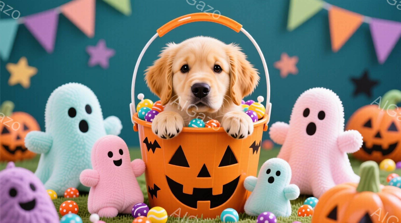 ゴールデンレトリバーがベージュ色のソファに座っており、ハロウィーンをテーマにした装飾が周囲に配置されています。ソファには、カボチャの顔が描かれたオレンジ色のクッションや、白黒ストライプのクッションが置かれ、床にはカボチャと幽霊の置物が並んでいます。全体的に暖かく、秋らしい、お祝いの雰囲気を感じさせます。