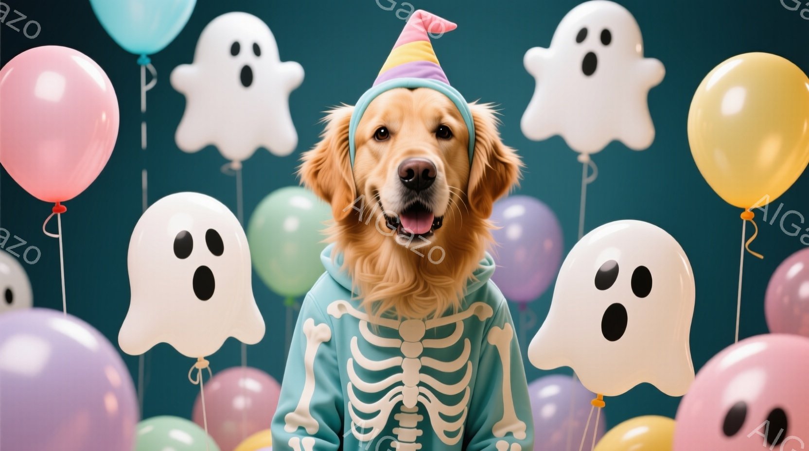ゴールデンレトリバーがハロウィーンの衣装を着て正面を見つめている。緑色の長袖シャツに白い骸骨模様が描かれ、同じく緑色の帽子を被っている。背景には、パステルカラーの幽霊の形をした風船が多数浮かび、お祝いムードを演出している。
