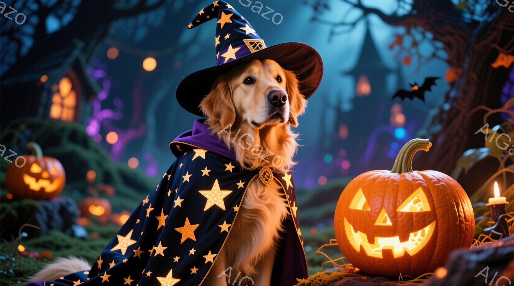 ゴールデンレトリバーが魔女の帽子と星が散りばめられたマントを身に着けて座っており、少し横を向いて自信に満ちた表情をしています。背景には、ぼんやりとした城、奇妙な木々、そして明るく光るハロウィーンのジャック・オー・ランタンが散りばめられた不気味な森が広がっています。全体的に、ハロウィーンの夜の魔法のような雰囲気を醸し出しており、ファンタジーと愛らしさが融合した印象を与えます。