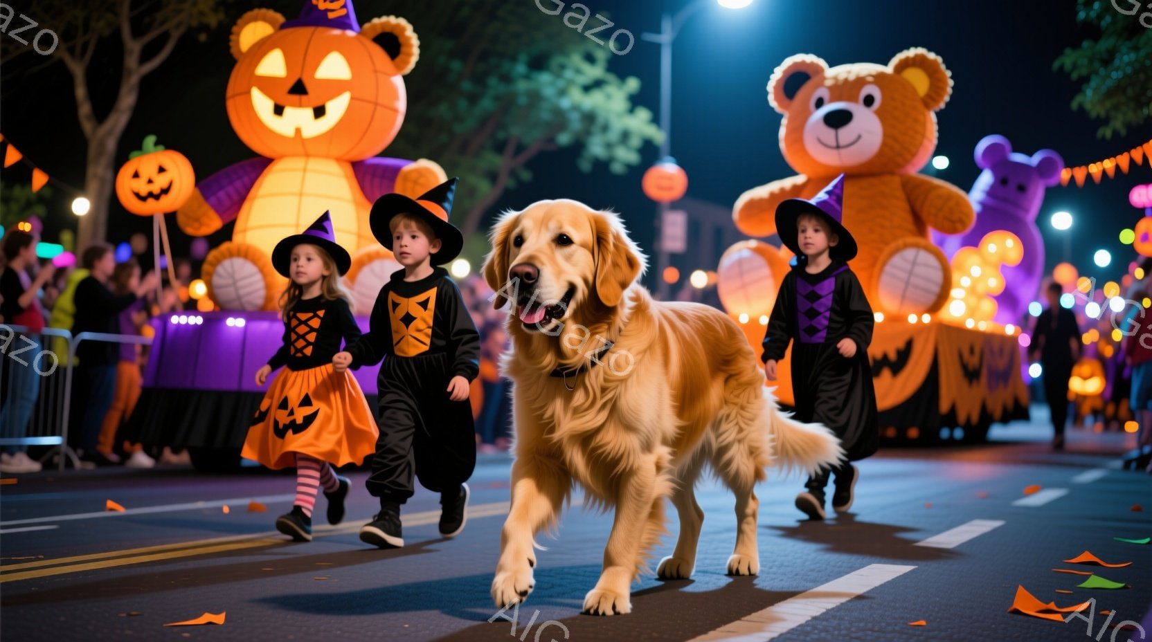 ハロウィーンの夜、金色のレトリバーが、ハロウィーンの衣装を着た2人の子供たちの間を先導して歩いている。子供たちはそれぞれ魔女とコウモリのコスチュームを着ており、お祭りの雰囲気を盛り上げている。背景には、かぼちゃやクマの大きな装飾が並び、夜空の下、楽しいハロウィーンの夜を演出している。