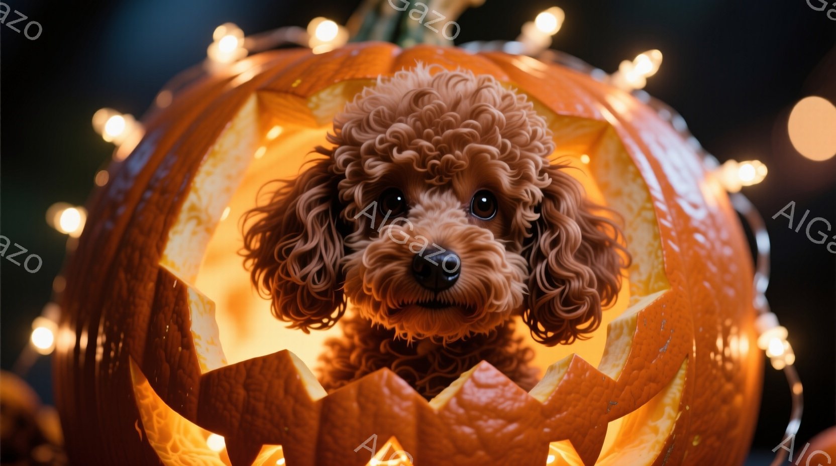 ふわふわの茶色の巻き毛を持つ犬が、ハロウィーンのジャック・オー・ランタンの中に顔を出しています。犬は前足をかけてジャック・オー・ランタンの中に座っており、黒い瞳でカメラを見つめています。背景にはぼんやりとした光のストリングが確認でき、温かくお祝いムードに満ちた雰囲気です。