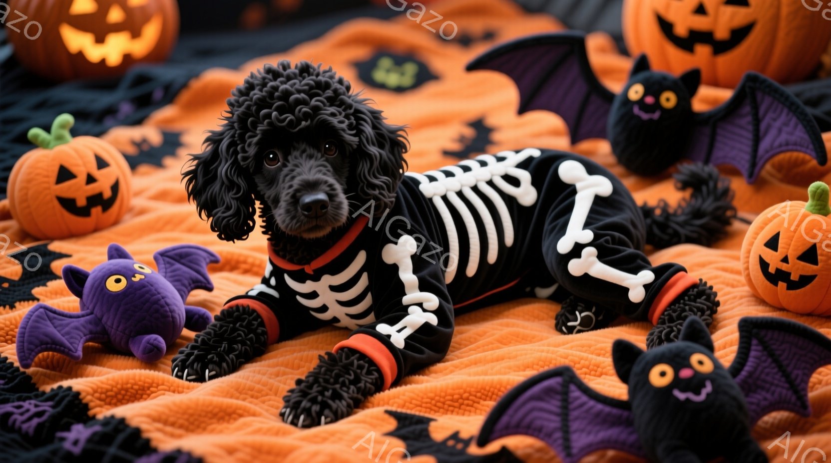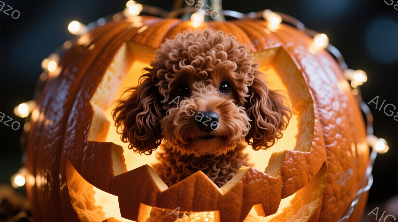 ふわふわの茶色の巻き毛のトイプードルが、ジャック・オー・ランタンの彫刻が施されたオレンジ色のカボチャの中にいます。犬は正面を向き、大きな黒い瞳でカメラを見つめており、好奇心と遊び心に満ちた表情をしています。背景は暗く、カボチャの周りに飾られた小さな電飾が暖かく優しい光を放ち、ハロウィーンらしいお祝いの雰囲気を醸し出しています。