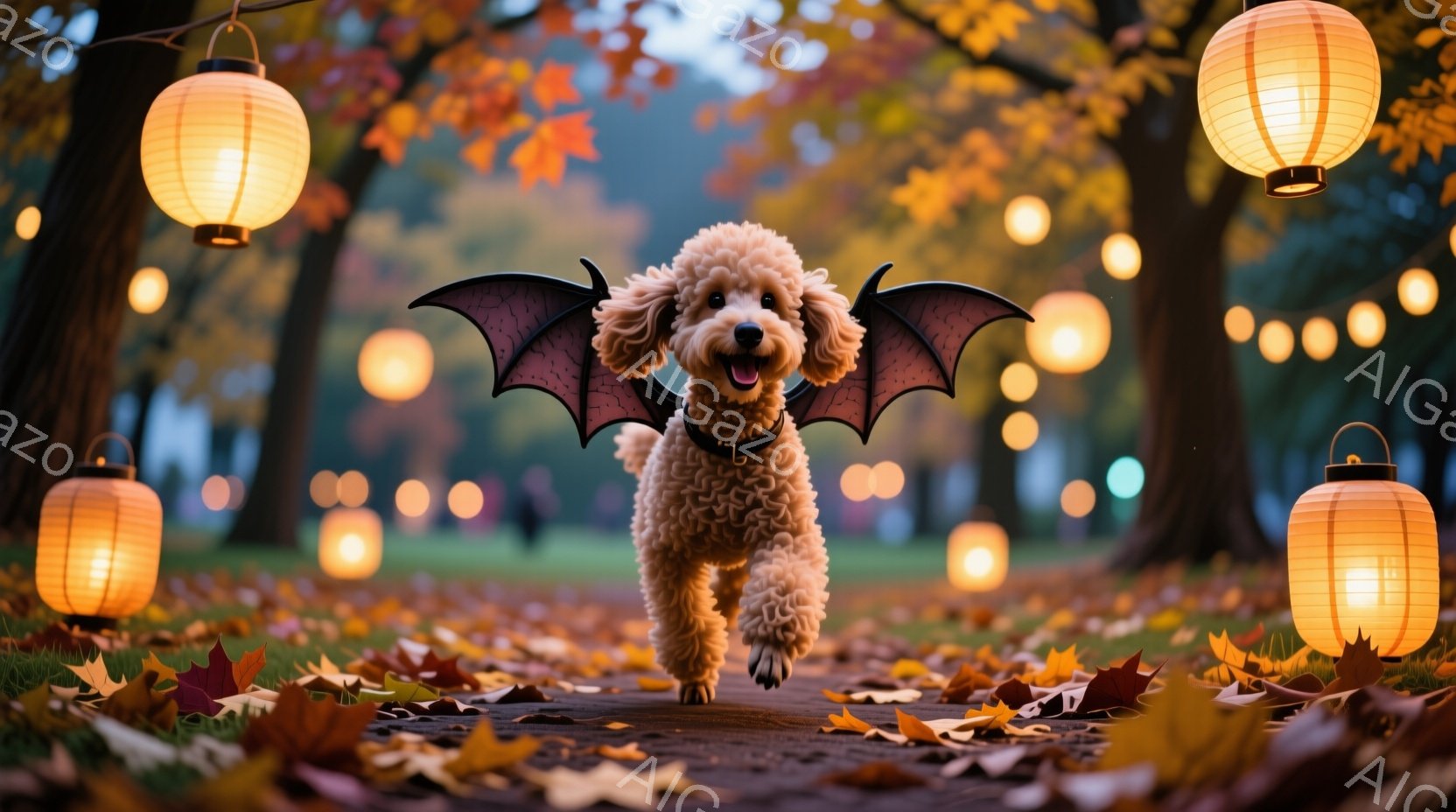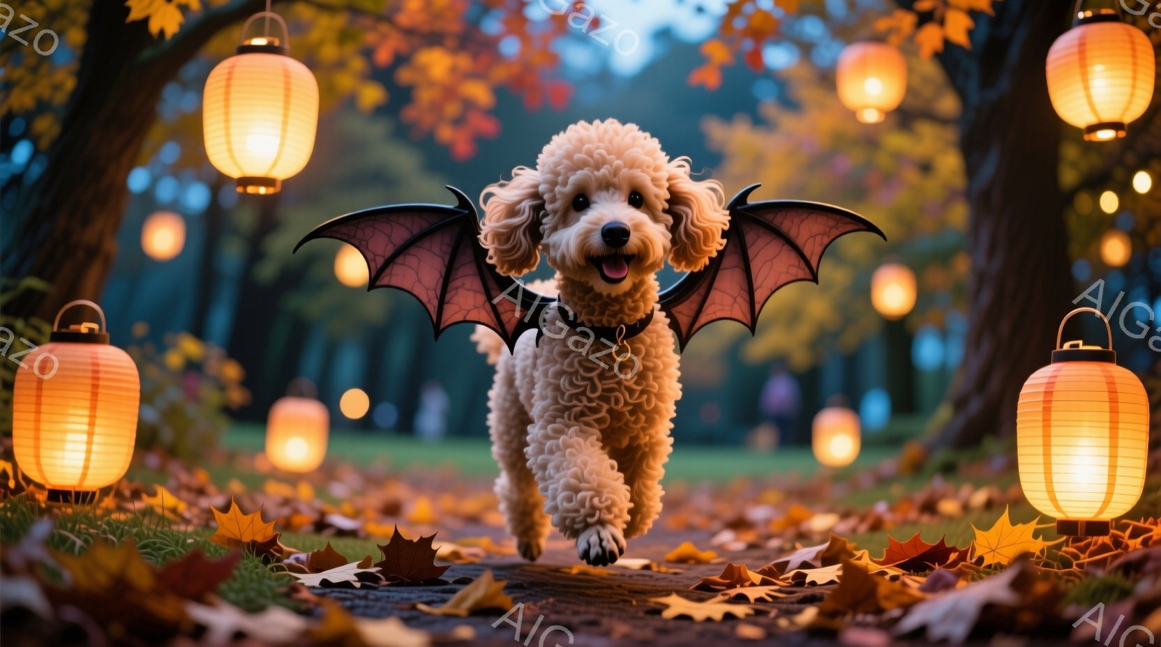 白い巻き毛のトイプードルが、黒いコウモリの翼をつけて、落ち葉が散らばる道を駆けている。背景にはオレンジ色の提灯が並び、秋の夜のハロウィンらしい温かく幻想的な雰囲気を醸し出している。犬は口を開けて楽しそうに微笑んでおり、活気に満ちた躍動感がある。