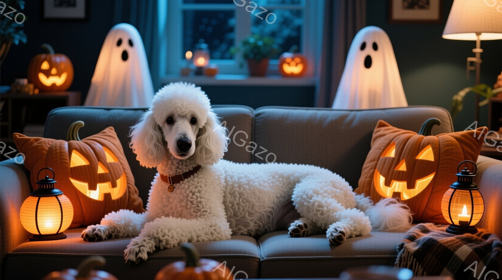 白い巻き毛の犬が、ハロウィーンをテーマにしたバスケットに入って微笑んでいます。バスケットにはキャンディーやカラフルな棒付きキャンディーが溢れており、背景には様々な表情をしたジャック・オ・ランタンと、コウモリやハロウィーンの飾りが散りばめられています。全体的に明るく、お祝いムード満点の可愛らしいハロウィーンの光景です。