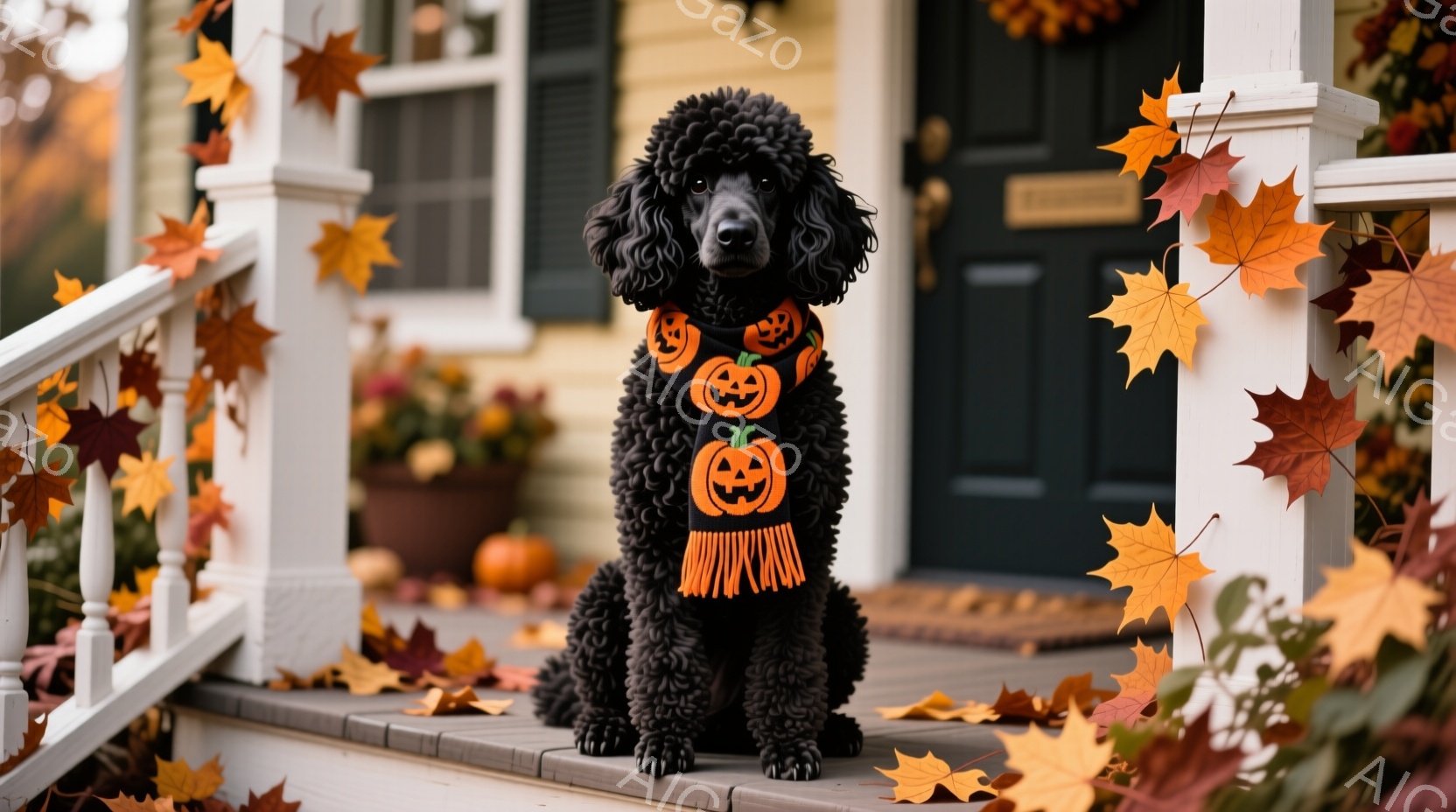 黒い巻き毛のスタンダードプードルが、ハロウィーンをテーマにしたオレンジと黒のストライプのショールを首に巻いて、ベランダの階段に座っています。背景には、ハロウィーンの飾り付けられた玄関と、落ち葉が散らばった秋の庭が見えます。全体的に、暖かく、秋らしい、お祝いの雰囲気です。