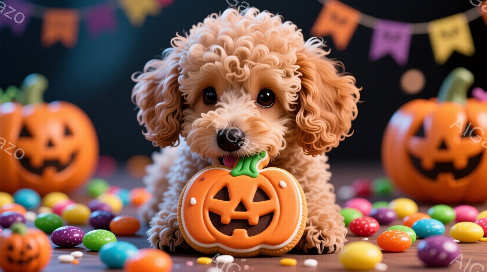 ふわふわのクリーム色の巻き毛を持つ子犬が、ハロウィーンのクッキー(カボチャ型で顔が描かれている)を口にくわえています。周囲にはカラフルなキャンディーが散らばり、背景にはハロウィーンの飾り付けやカボチャのランタンが見えます。全体的に暖かく、可愛らしい、お祭り気分満載の雰囲気です。