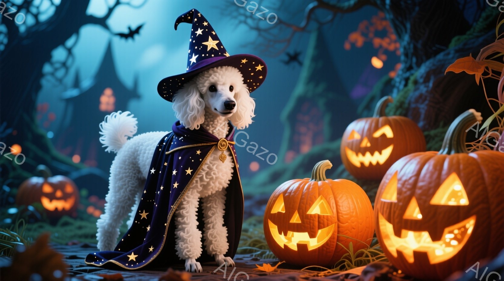 この無料AI生成画像「ふわふわのクリーム色の巻き毛を持つ子犬が、ハロウィーンのクッキー(カボチャ型で顔が描かれている)を口にくわえています。周囲にはカラフルなキャンディーが散らばり、背景にはハロウィーンの飾り付けやカボチャのランタンが見えます。全体的に暖かく、可愛らしい、お祭り気分満載の雰囲気です。」は、2025年10月24日に作成されました。 サイズは 1664×928px の高解像度で、商用利用も可能なフリー素材として提供しています。