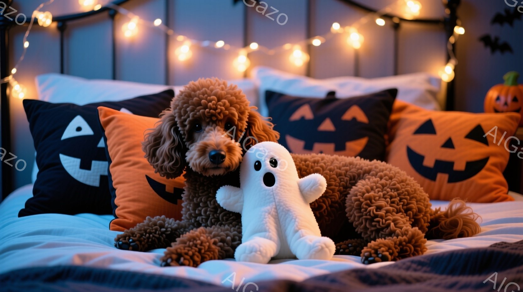 明るい寝室のベッドに、ふわふわの茶色の巻き毛の犬が横たわっています。犬は白いお化けのぬいぐるみを抱きしめ、ハロウィーンをテーマにしたクッションに囲まれています。ベッドの背景には、ハロウィーンの装飾が施された部屋の様子が見え、暖かくお祝いの雰囲気が漂っています。
