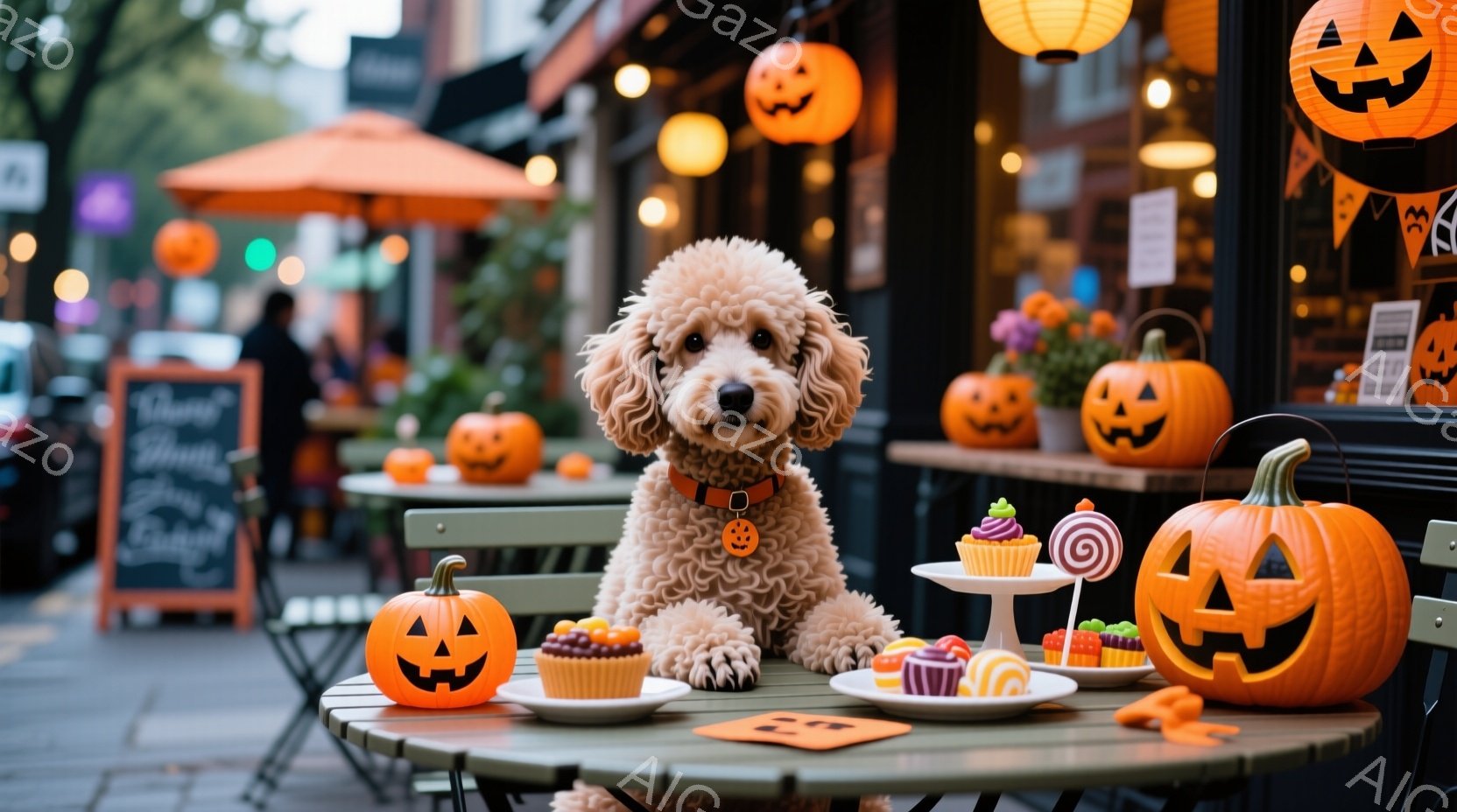 この無料AI生成画像「白い巻き毛の犬が、骸骨柄の緑色のパーカーを着ています。犬は正面を見て笑顔で、少し上体を傾けています。背景には、白く愛らしいお化けと、ピンク、水色、薄紫色の風船が浮かんでおり、ハロウィーンのような楽しい雰囲気が漂っています。」は、2025年10月24日に作成されました。 サイズは 1664×928px の高解像度で、商用利用も可能なフリー素材として提供しています。