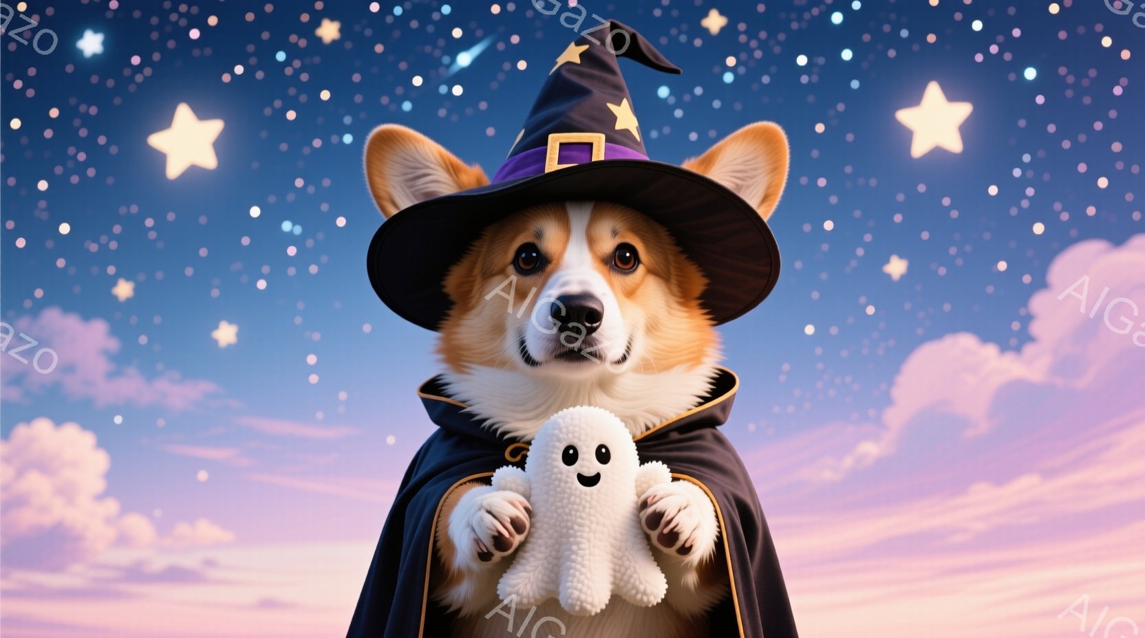 コルギが魔法使いの衣装を着て、白いお化けの人形を抱えています。黒いマントと先のとがった帽子を身につけ、少し微笑んでいる表情でカメラを見つめています。背景は、星が輝く夜空と、パステルカラーの雲が広がる幻想的な風景です。