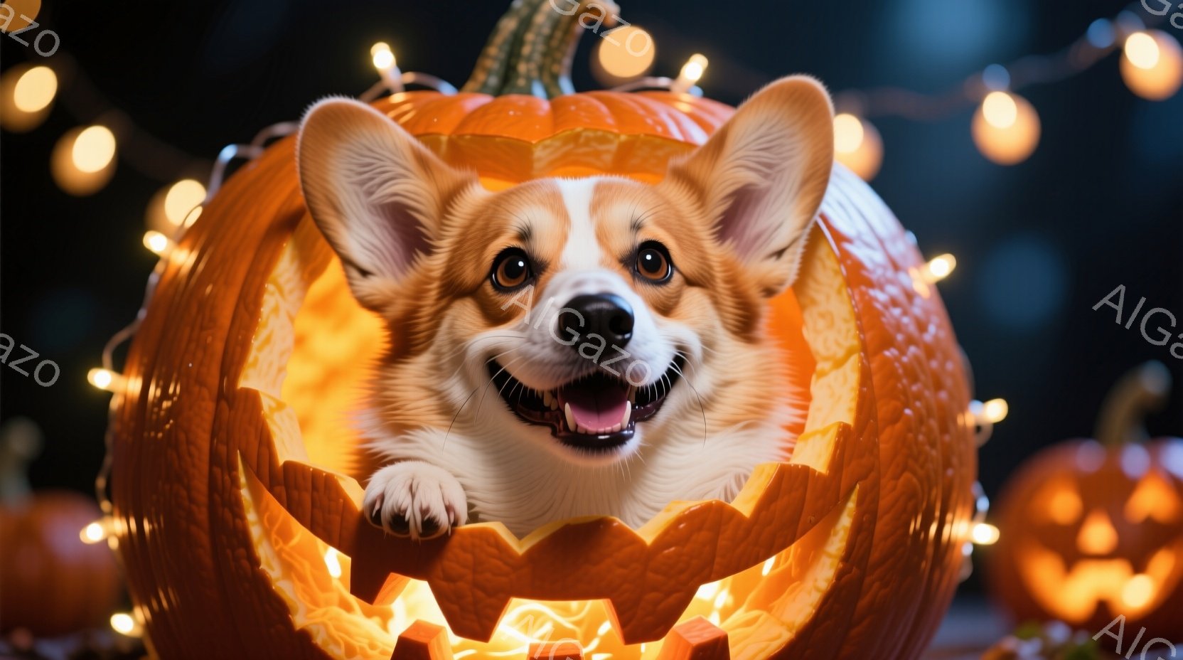コーギー犬が、くり抜かれたハロウィーンのジャック・オー・ランタンの中に顔を覗かせています。犬は口を開けて笑顔を見せ、とても楽しそうな表情をしています。背景には他のジャック・オー・ランタンと、暖色系のイルミネーションが飾られており、温かくお祝いムード満点の雰囲気です。
