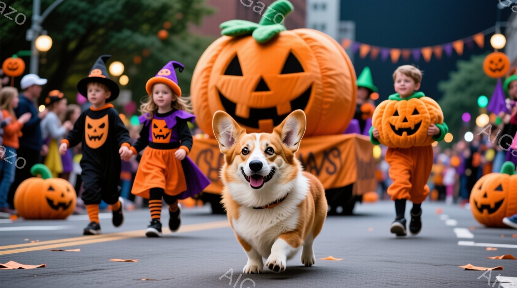 ハロウィーンのパレードの様子で、オレンジ色のカボチャの衣装を着た小さな子供たちが走り、その手前には笑顔のコーギー犬がこちらに向かって走ってきている。背景には大きなカボチャのフロートやカラフルな風船が並び、楽しげな雰囲気が漂っている。道路には落ち葉が散らばっており、秋のハロウィーンイベントを象徴している。