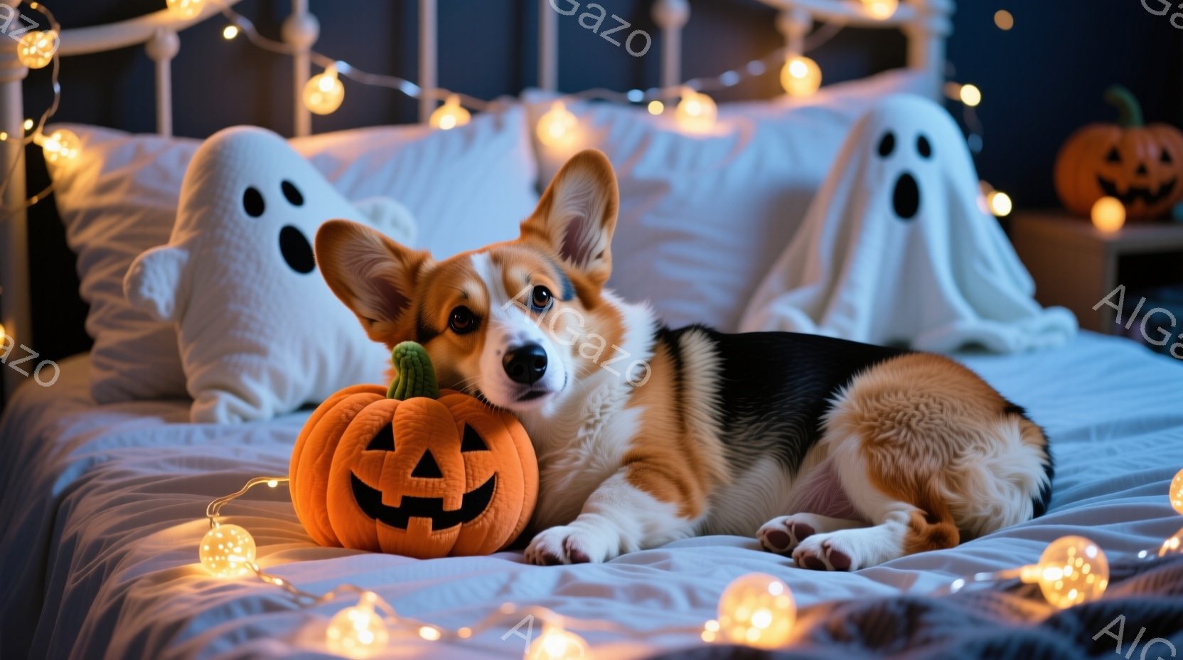 コルギ犬がハロウィンの装飾が施されたベッドの上で横たわっています。オレンジ色のカボチャの置物が犬の頭の横に置かれ、白い幽霊の形をした枕が背景に並んでいます。暖かい色の電球がベッドの周りを飾り、全体的にハロウィーンらしい、落ち着いた雰囲気を醸し出しています。