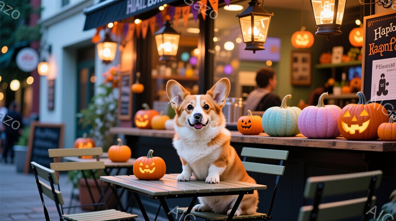 屋外のカフェのような場所で、可愛らしいコーギー犬がテーブルの上に座っています。背景にはハロウィーンの装飾が施されたカフェのカウンターや、色とりどりのハロウィーンのランタンやカボチャが並び、秋の夜の暖かく幻想的な雰囲気が漂っています。犬はカメラに向かって少し微笑んでいるように見え、その愛らしい姿が視線を惹きつけます。