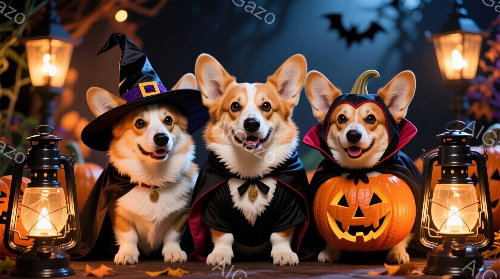 三匹のコーギー犬がハロウィーンの衣装を着て並んでいます。左の犬は魔女の帽子とリボン付きの襟巻をつけており、真ん中の犬はヴァンパイア風の黒いマントとリボンをつけ、一番右の犬はジャック・オー・ランタンの帽子をかぶっています。背景には、ハロウィーンの装飾、カボチャ、そしてぼんやりとしたシルエットがあり、全体的に楽しいハロウィーンの雰囲気を醸し出しています。
