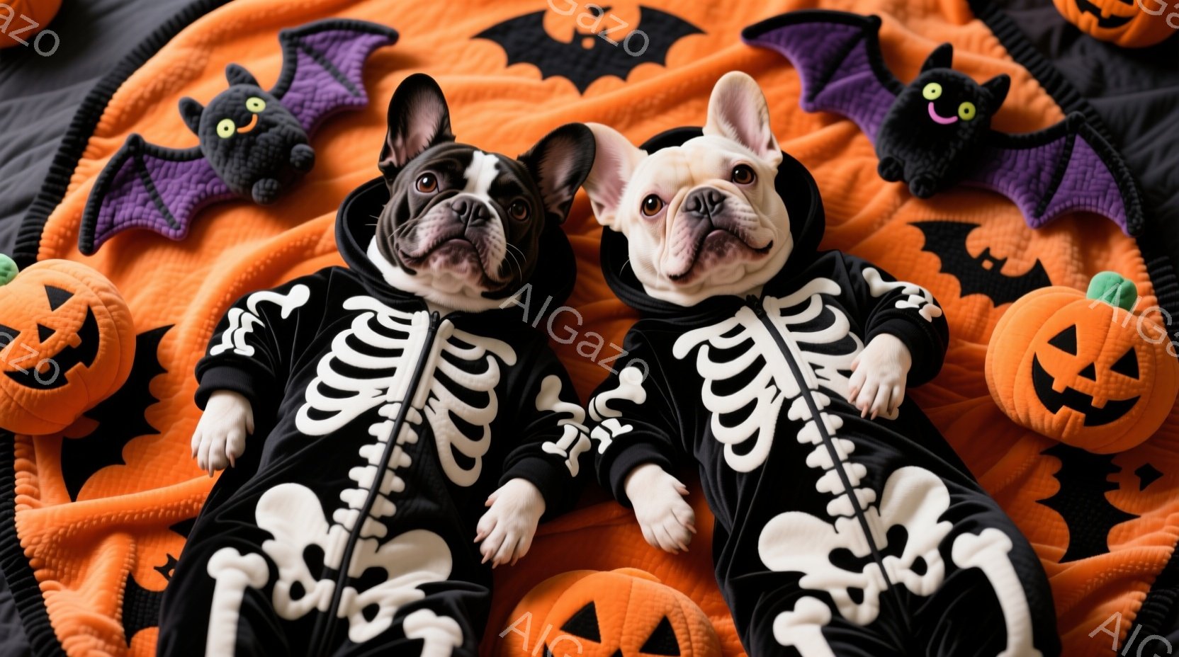 ハロウィーンの背景に、骨格模様の衣装を着たフレンチブルドッグの双子が写っています。双子は仰向けになり、リラックスした表情でカメラを見ており、ハロウィーンの装飾品(カボチャ、コウモリ、おばけ)に囲まれています。全体的に、楽しくてお祝いムードに満ちた雰囲気です。