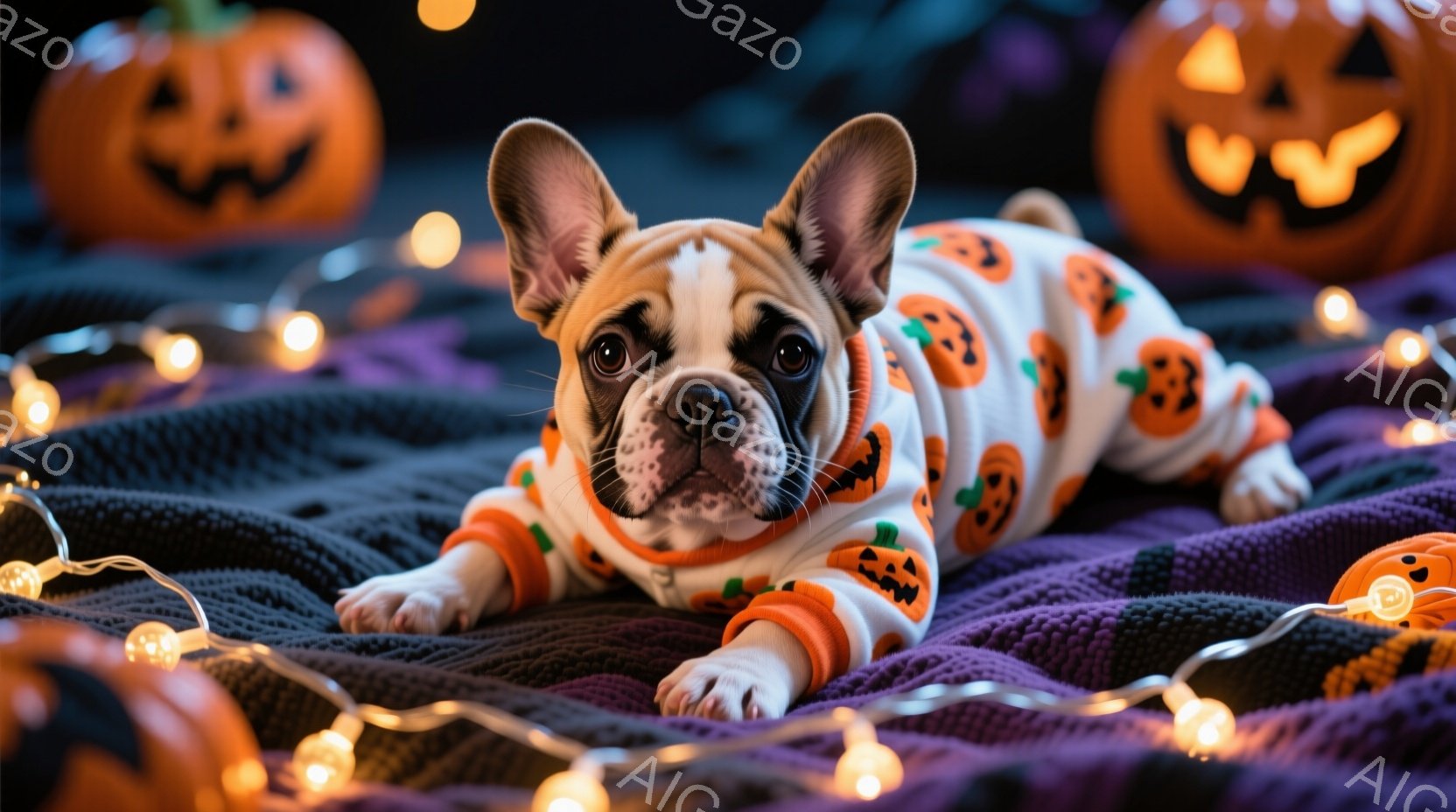 フレブル(フレンチブルドッグ)が、星柄のケープと先のとがった魔女帽子を身につけて座っています。背景には、ジャック・オー・ランタンがいくつか置かれ、暗い森とシルエットの建物が薄暗い夜空の下に見えます。 全体的に、ハロウィンの夜の神秘的で楽しい雰囲気です。
